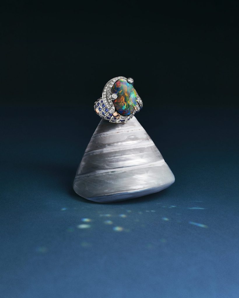 除了自然元素,設計師還把海洋裡的傳說帶到現實。Mermaid系列是一個充滿幻想的篇章。鉑金與玫瑰金交錯出美人魚的姿態,尾鰭上嵌著超過十克拉的黑蛋白石,在燈光下閃現藍綠色的光澤。這組作品還有戒指、耳環與項鍊,每一件都像是從童話裡游出來的角色。Ocean Flora系列則推出一只獨一無二的高級珠寶腕錶,以珍珠母貝錶盤搭配鑽石鍊帶,細節裡藏著海草與花朵的紋理,優雅中透著想像力。