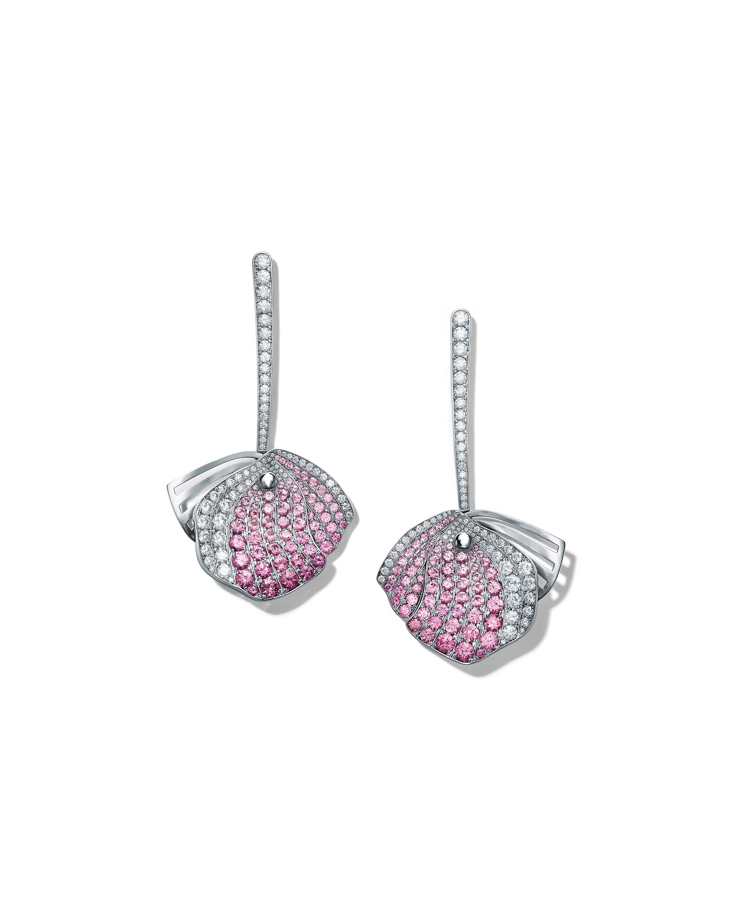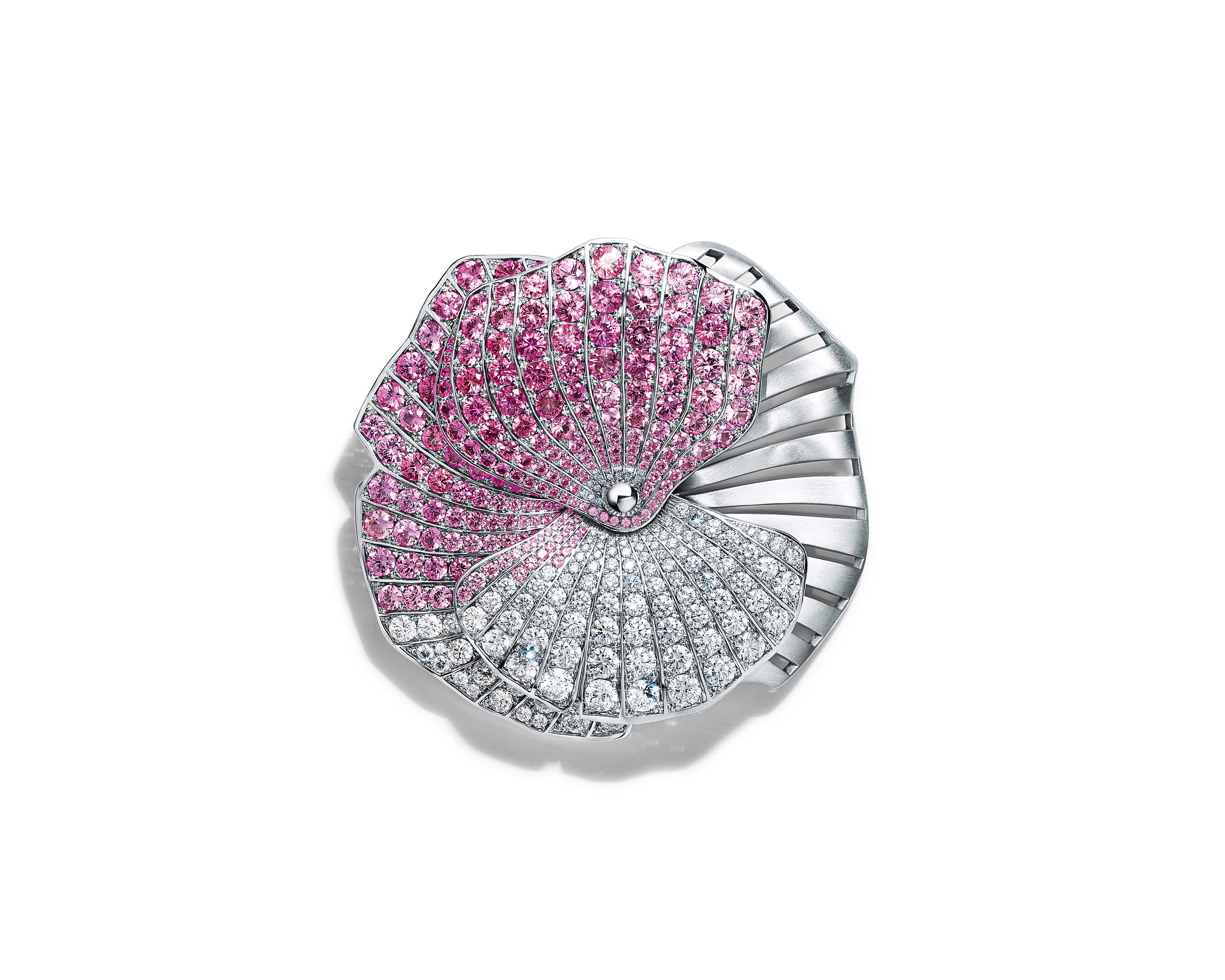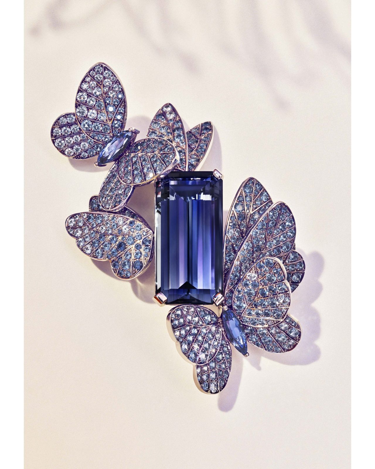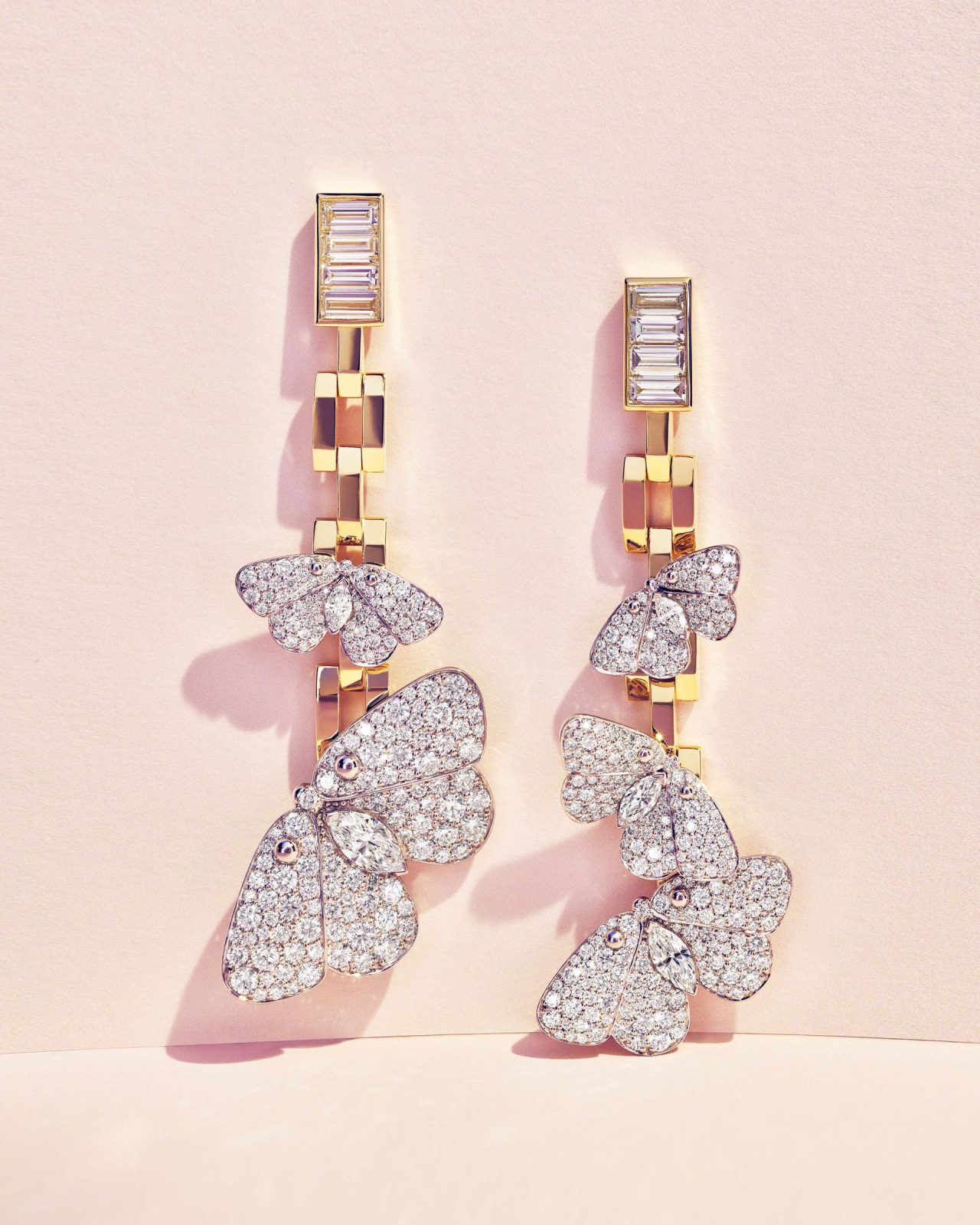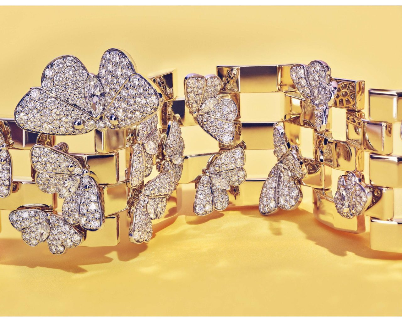 炎炎夏日,柔軟、顫動的鑽石鑲嵌的飛蛾與線條剛勁的角形鏈條形成了鮮明對比。鏈條的靈感來自於20世紀40年代的坦克鏈。這條18kt黃金手鍊上固定著大小不同的飛蛾,似乎在飛行或停歇。飛蛾的逼真圖案與動態給這款經典手鍊增加了新鮮的現代感。這些嬉戲的飛蛾由1115顆超過6克拉的圓形明亮式切割鑽石,以及23顆欖尖形切割鑽石在鉑金上鑲嵌而成,光彩奪目,栩栩如生。