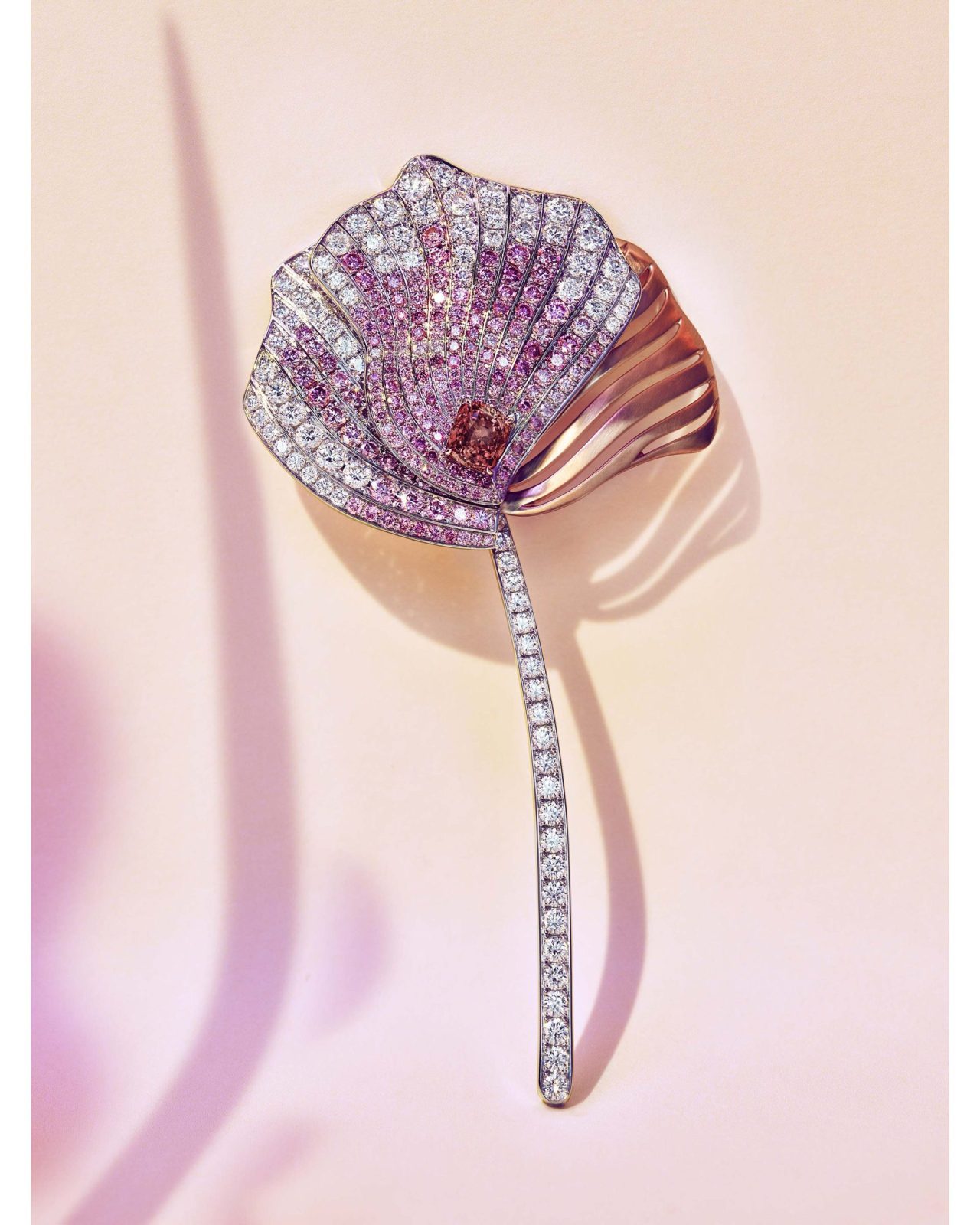 時至金秋,遵循著自然法則的葡萄藤歷經萌芽、開花之後,在重疊的鉑金之上,由混合切割鑽石鑲嵌,構成了秋日主題的藤蔓圖案。蔓蔓長藤,片片細葉,或於頸項上,或於手腕間,悄然伸展,輕柔纏繞,將秋意傳達。