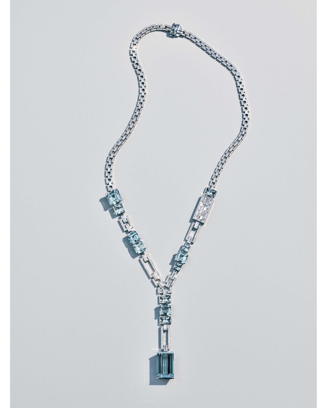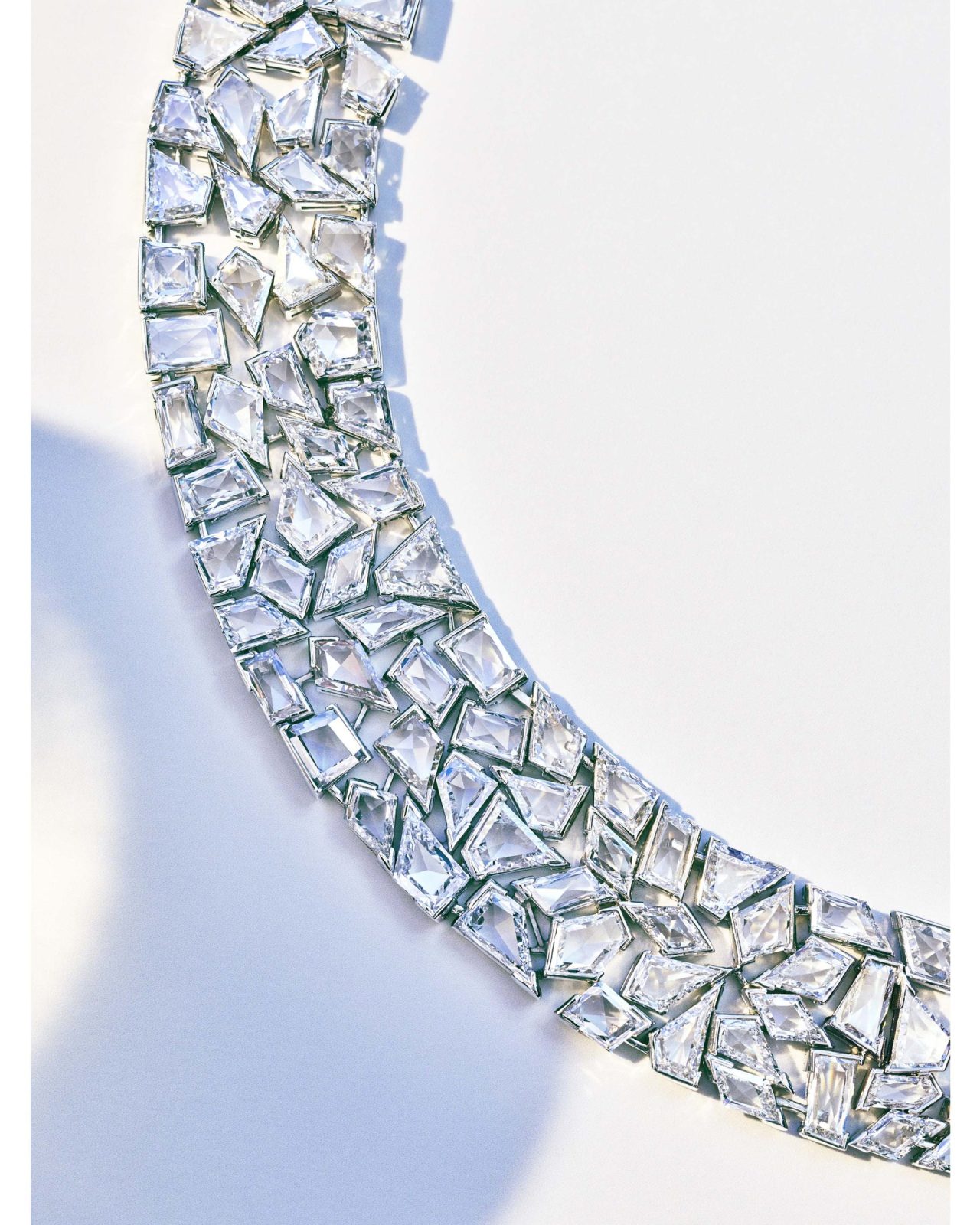 冬季主題中最具代表性的設計、也是我們最偏愛作品之一,就是碎冰項鍊。這款項鍊的冰雕圖案前所未有,需要最熟練的工匠潛心研究不規則之美,並付諸實踐於鑽石之上。碎冰的視覺效果是通過分別將每一顆鑽石切割成鋸齒般的獨特形狀來達到的,整體上如同在鉑金製成的海平面上漂浮的冰山。 Reed在談到設計過程時說:「冰的想法更多受啟發於冰受力破裂時展現出來的不規則性與無縫性。我們想做的不是製造出破碎冰塊的仿製品,而是要將其中的感覺表達出來。」