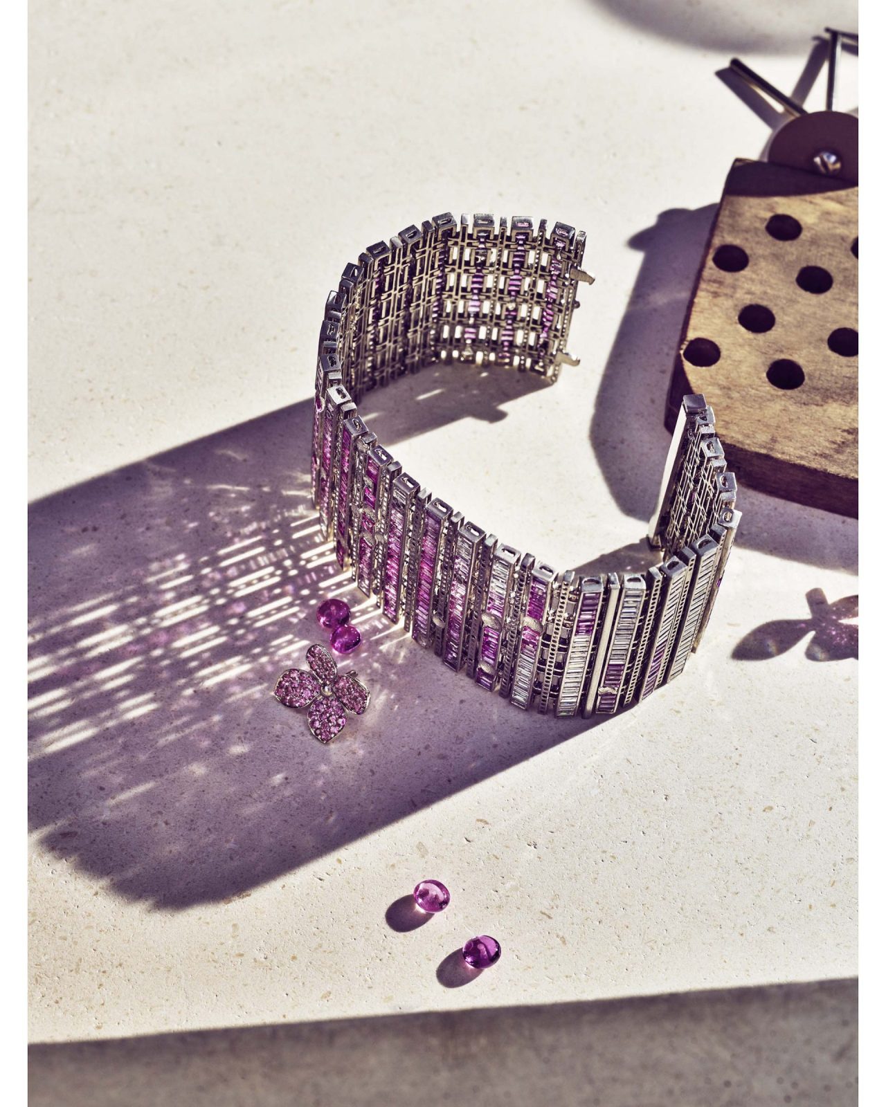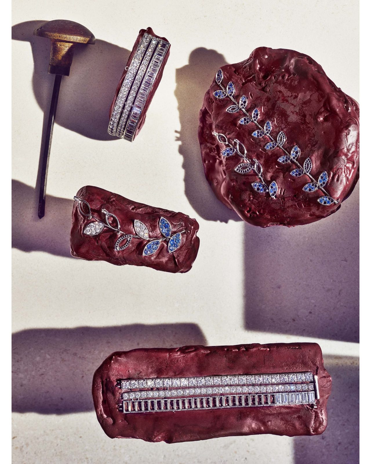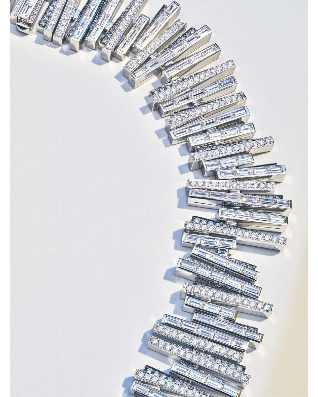 「我該怎麼做呢?」Melvyn回憶起當他拿到 Reed 的設計草圖後自己的第一反應時,他笑起來,「我當時什麼也沒說。我只是笑了!」這裡涉及了相當高水平的技術難度——那些既要擁有完美的切割,又要具備隨機的獨特形狀的鑽石塊,就是一個個馬賽克,它們需要被協調的鑲嵌在一起,同時還要能展現出鑽石的光彩,確保飾品設計的流動性、靈活性、連續性、耐磨性,並避免露出過多的底座金屬——這真是太難實現了。
