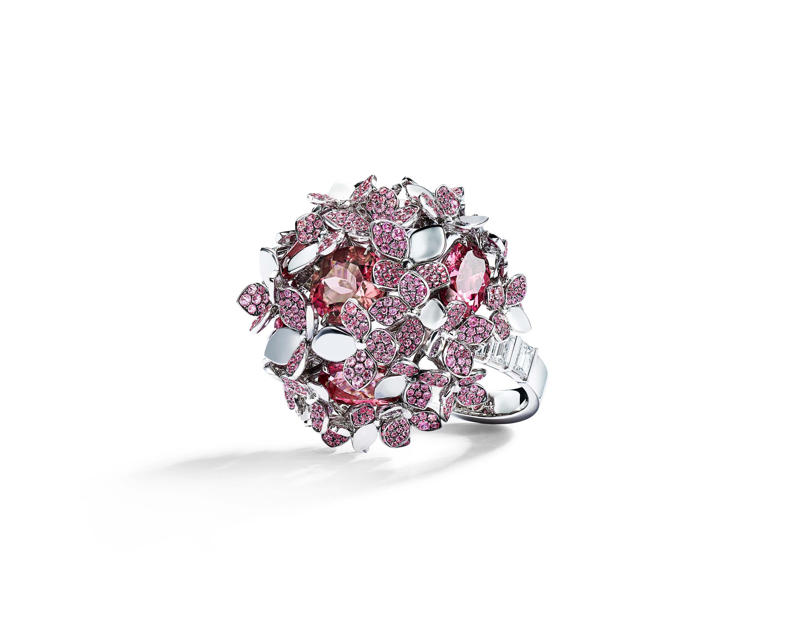 春天的主題建立在自然世界的隨機與不對稱之美的基礎上。繡球花的設計意在展現花朵群集的複雜與精細,構成繡球的眾多小花偏離中心,由混合切割的鑽石與多色調的粉紅藍寶石 (pink sapphires) 、碧璽以及坦桑石並置鑲嵌,營造一種色彩漸變的效果。 電影《蒂芙尼的早餐》令蒂芙尼的店鋪櫥窗廣為人知。為延續這一傳奇,視覺團隊將花朵凍結在冰塊之中。櫥窗展示經過了一絲不苟的計算,令冰塊在一天的時間裡慢慢融化,將冰封其中的花朵顯露出來。