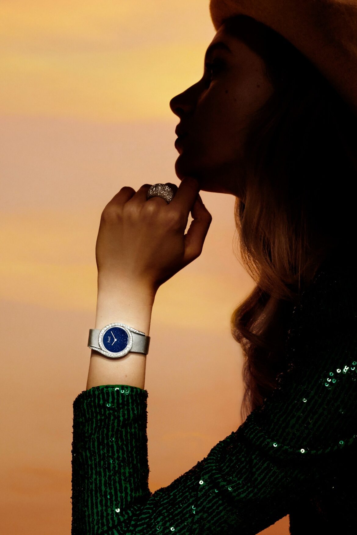 限量300枚的新款Limelight Gala Aventurine配備32 毫米的白金錶殼,兩個細長的錶耳上鑲嵌 62 顆鑽石組成的漩渦,並配有一個罕見的砂金石錶盤。砂金石是一種可追溯到 17 世紀,源自威尼斯著名的玻璃製造區穆拉諾的礦物變體,一説當時砂金石的發現只是偶然,今天,工匠通過在砂金石玻璃中添加氧化銅來模仿銀河系中的恒星。閃耀的砂金石錶盤和鑽石錶耳搭配了極為細緻的白金米蘭編織錶鏈。手工製作手鏈採用了與高級訂製禮服所相當精致程度的奢華工藝,通過將一根金線製成螺旋狀並編織在一起以締造柔軟的金質織物,需由至少八位Piaget工匠花費超過 100 小時制作而成。每個手鏈由 366 條螺旋線和一個滑扣組成,提供極高的舒適度和非凡的靈活性。