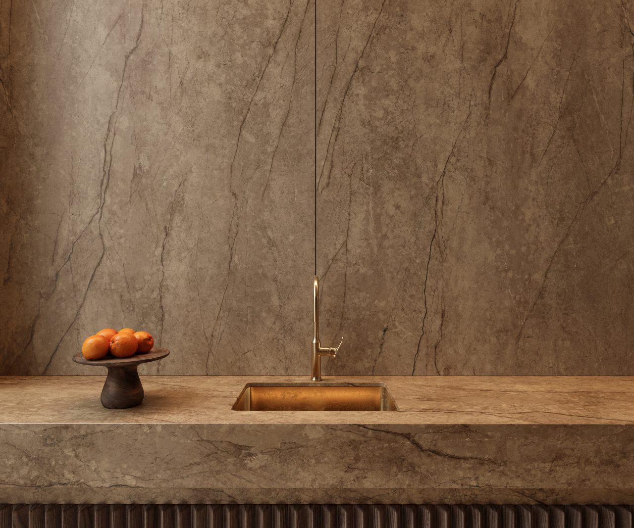Éclos另一個重點,是 Cosentino 自家開發的 Inlayr 技術。此技術不是只在板材表面做花紋,而是把紋理做進整塊板材裡。也就是說,不只正面有紋路,連側邊切開來看,花紋也會延續下去,看起來比較自然,不會有表面貼皮的感覺。這樣的做法能讓整體質感更接近天然石材,摸起來也比較有層次。檯面在做倒角、收邊或特殊造型時,不用擔心切面露出不同顏色或斷層,整體視覺會比較一致。對一般消費者而言,也許不會第一時間注意到技術細節,但長期來看,這些改變會影響大眾每天使用廚房與浴室檯面的方式。