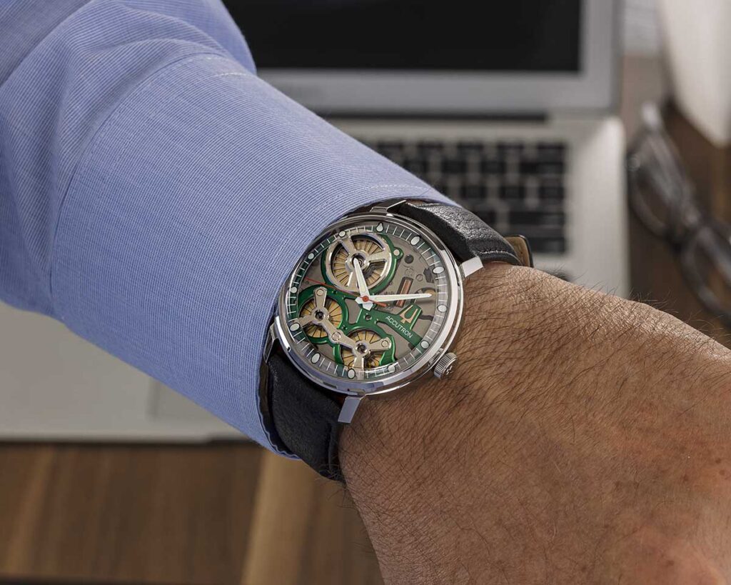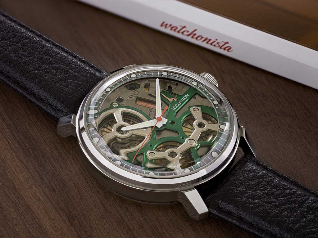 Accutron Spaceview 2020這款腕錶問世時的宣傳口號是:「全球首款靜電能驅動腕錶。」該款腕錶的錶盤設計乍一眼看去和傳統的機械手錶非常類似,都是最大限度地呈現出了內部結構之美,但它和機械腕錶的運作原理截然不同:它利用運動時手臂的擺動帶動腕錶內渦輪的旋轉,並產生靜電能存儲於蓄電池內,並傳遞給Accutron首創的靜電電機,一個電機供能於時針和分針,另外一個電機供能秒針。除了技術方面展現出了革命性的創新之外,它的走時誤差每月只有正負五秒,即使是一般的石英機芯也無法與之媲美。