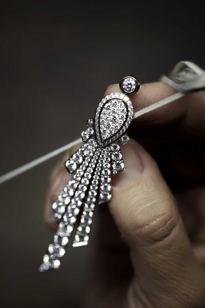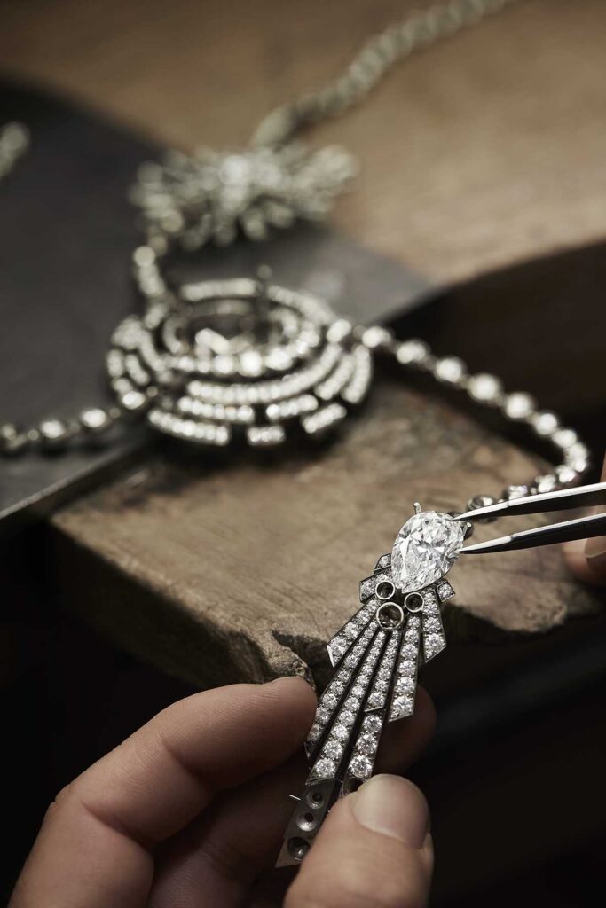 約50件以鑽石、黃鑽,結合鉑金或黃金的珠寶組成Bijoux de Diamants系列,除了星體,也有蝴蝶結、羽毛、幾何圖形等香奈兒女士鍾愛的設計。「她所創造的臻品珠寶系列,不僅在那個時候引起了轟動,直到今天它仍然是香奈兒珠寶設計的基石,」品牌全球高級珠寶暨腕錶銷售與傳媒總監Marianne Etchebarne分享道:「香奈兒女士對於珠寶的見解是頗具先鋒性的,她的想法是創作歷史上第一個圍繞單一總主題——她的宇宙的象徵(天體與時裝)——的臻品珠寶系列,她那個時代的其他珠寶商從未這樣嘗試。她遵循了使她在時裝界享有盛譽的原則,並將其應用於珠寶——通過栩栩如生的帶妝模特展示這些作品的佩戴方式以及它們如何活動,如此一來,女性可以立即想像自己佩戴珠寶的樣子。」