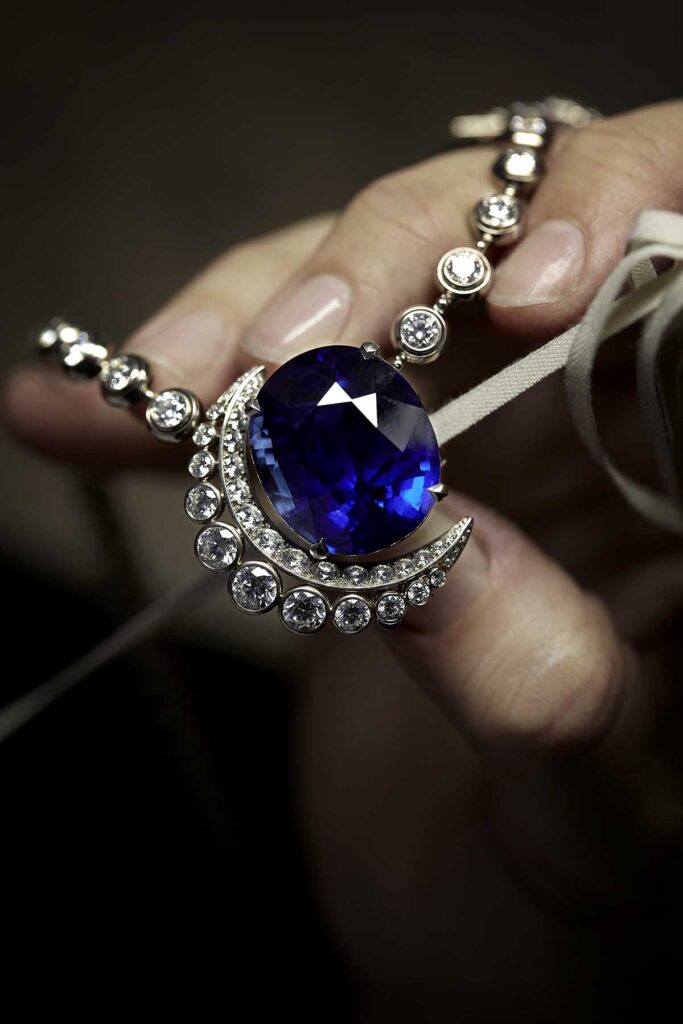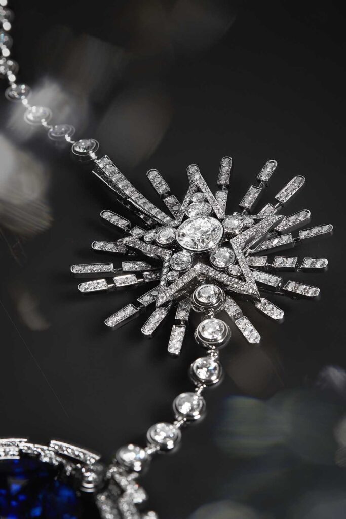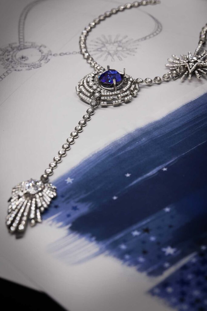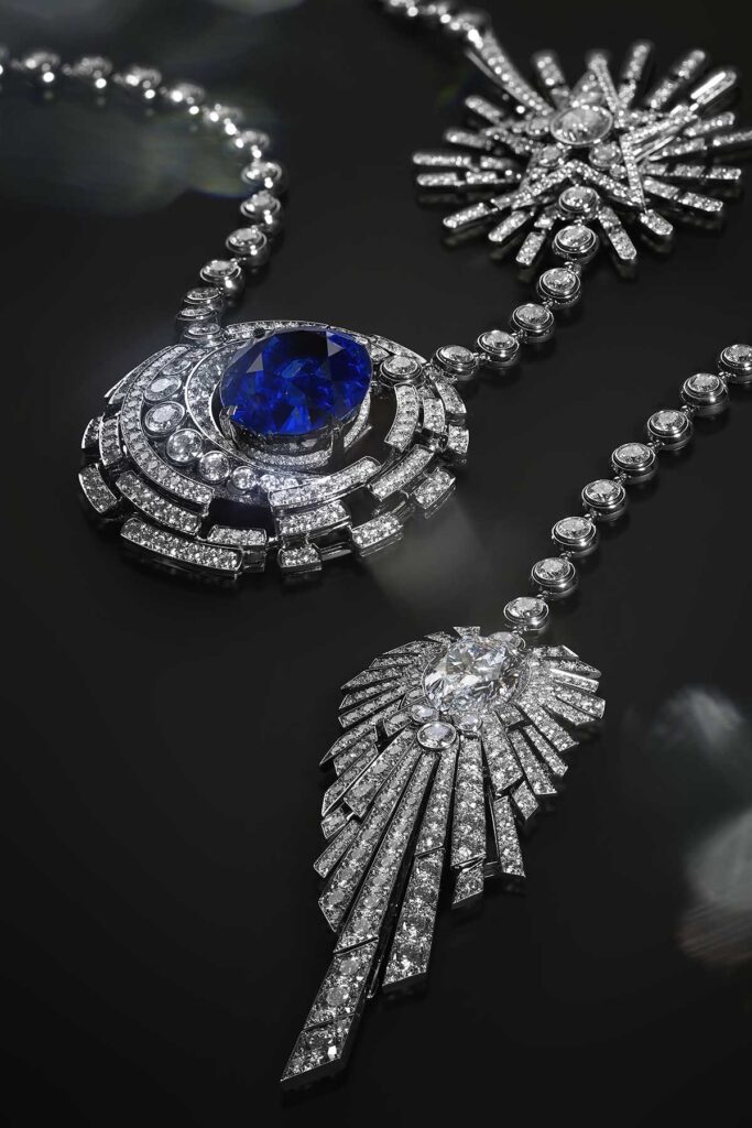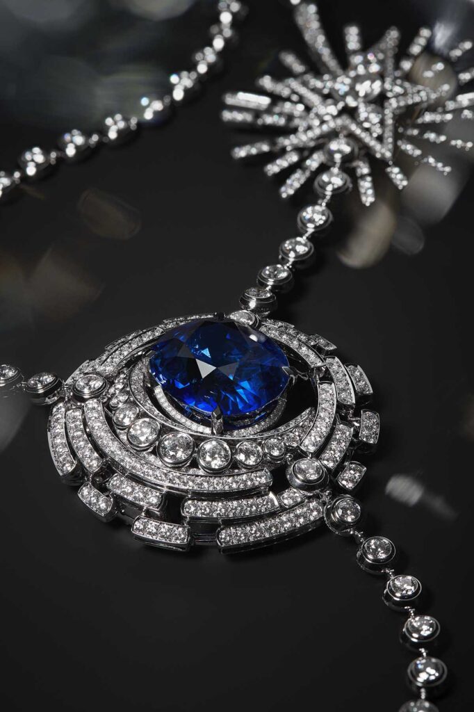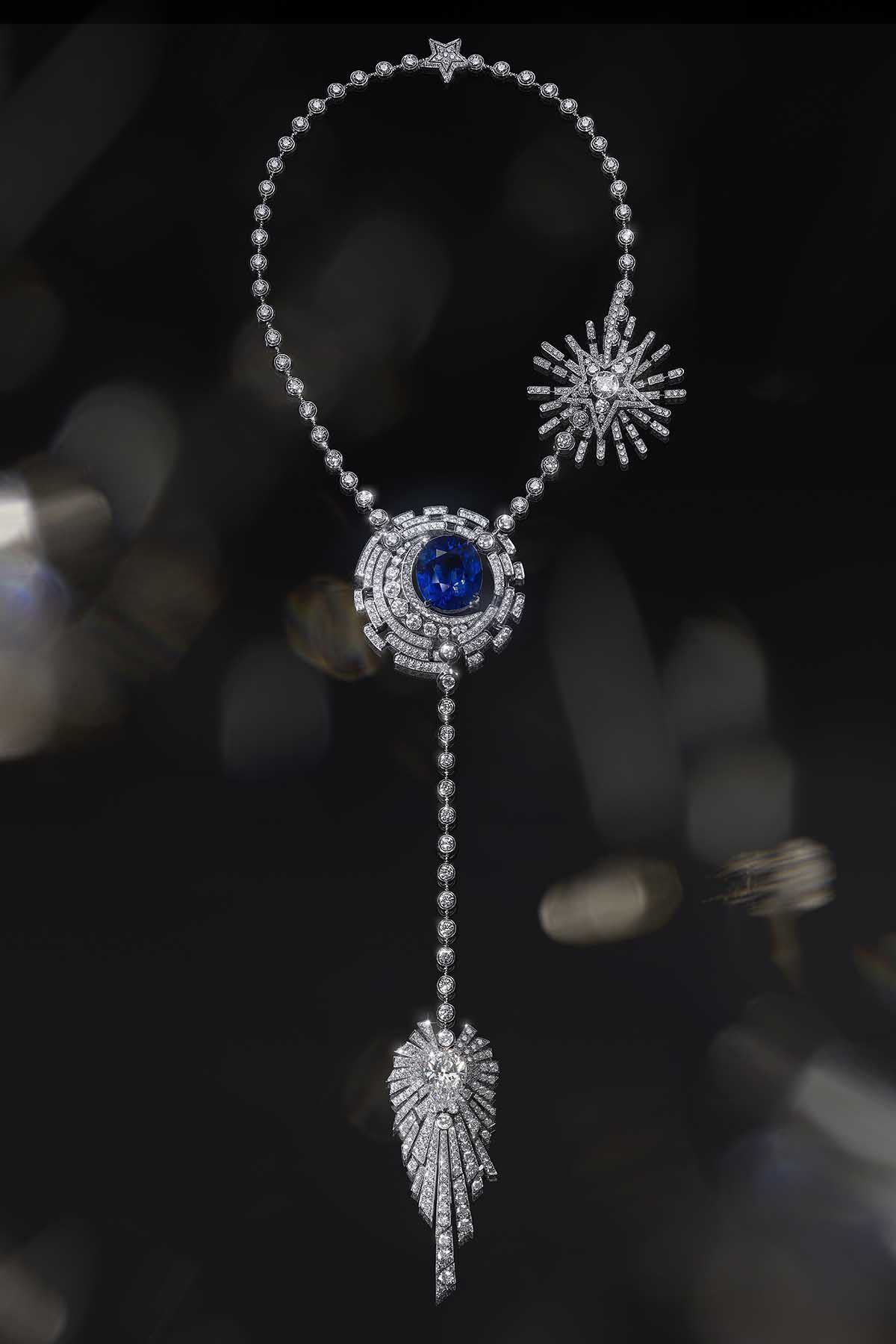 1932臻品珠寶系列新作中的代表傑作Allure Céleste項鏈,正如其名所示,展現出一副令人神往的天空之境。明亮式切割鑽石連接成星河和天體的光芒,彎彎的新月擁抱著一顆夜空一般深邃的55.55克拉橢圓形藍寶石,同時也是致敬香奈兒女士最愛的數字。一顆8.05克拉的梨形切割鑽石成為下擺彗星的閃耀中心,四周綻放迷人光芒。Allure Céleste項鏈可以多種方式配戴,包括短項鍊、胸針和手鏈,延續香奈兒女士崇尚自由的設計理念。