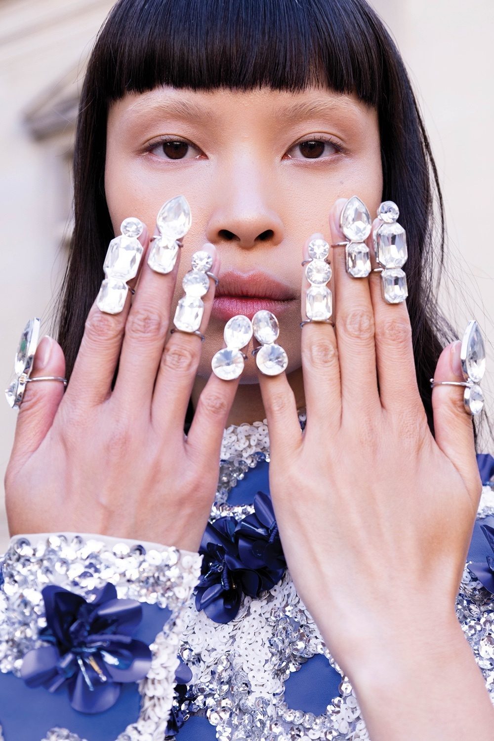 在此次系列的設計中,依然可見到豪華的人造貂皮和水晶珠寶等經典元素。Piccioli將現代與傳統融合,把皇冠植入髮絲,打造出埃及艷后風格的水晶假髮;水晶燈則轉化為華麗的吊墜耳環,與輕盈的材質形成鮮明對比,賦予整體動感,與服裝相得益彰;珠寶鑽戒也成為水晶指甲的一部分。羽毛也是他喜愛運用的元素之一,精心裝飾的羽毛隨著模特兒的步伐輕盈地顫動,成為頭飾或裙擺,呈現出系列的靈動氣質。繽紛的色彩在大塊的面料上呈現,如玫紅、桃紅、青金石藍、亮綠和祖母綠,為整個系列注入強烈的視覺對比。