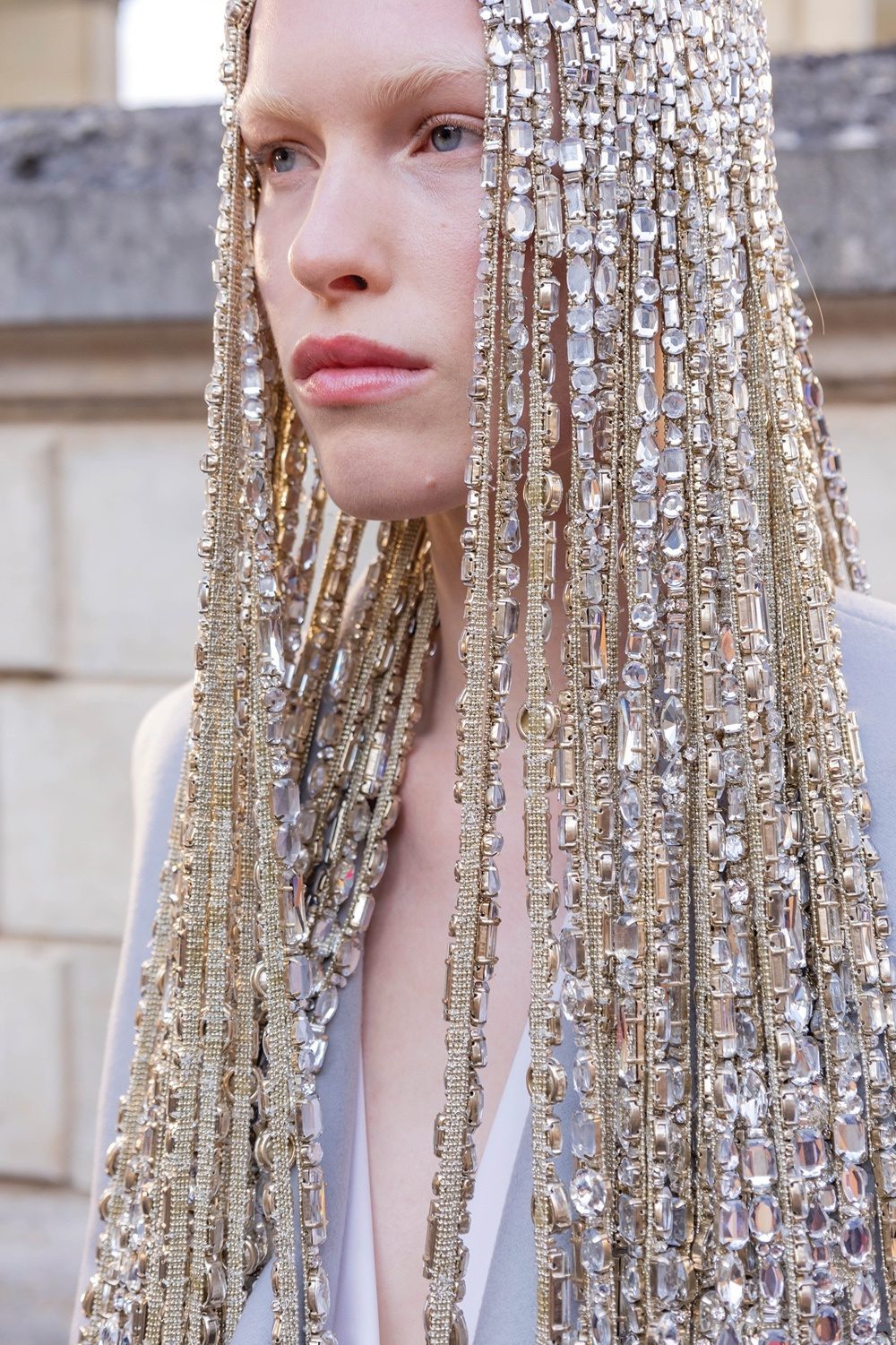 在此次系列的設計中,依然可見到豪華的人造貂皮和水晶珠寶等經典元素。Piccioli將現代與傳統融合,把皇冠植入髮絲,打造出埃及艷后風格的水晶假髮;水晶燈則轉化為華麗的吊墜耳環,與輕盈的材質形成鮮明對比,賦予整體動感,與服裝相得益彰;珠寶鑽戒也成為水晶指甲的一部分。羽毛也是他喜愛運用的元素之一,精心裝飾的羽毛隨著模特兒的步伐輕盈地顫動,成為頭飾或裙擺,呈現出系列的靈動氣質。繽紛的色彩在大塊的面料上呈現,如玫紅、桃紅、青金石藍、亮綠和祖母綠,為整個系列注入強烈的視覺對比。