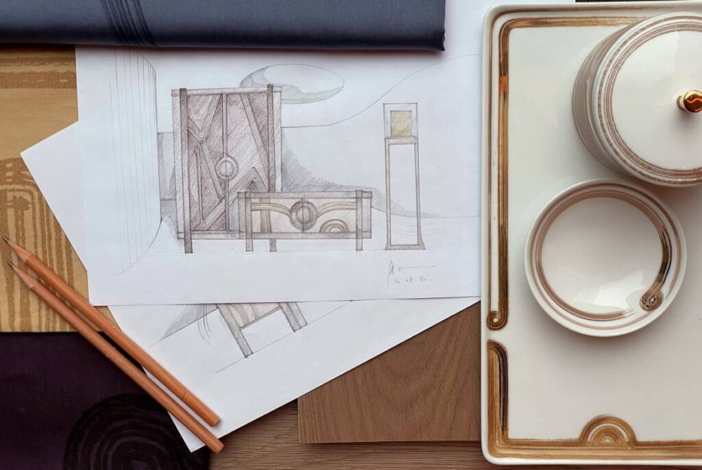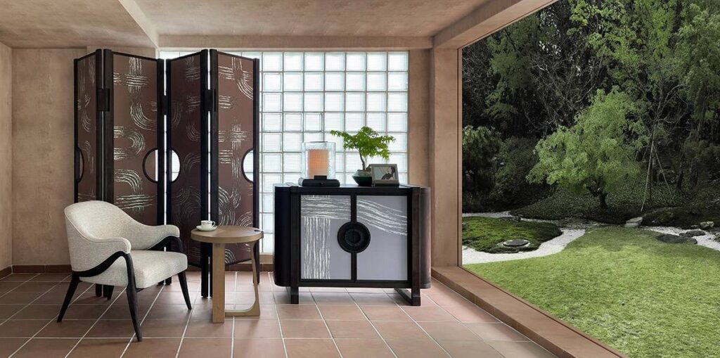 定義新奢華的設計理念不止貫穿傅厚民的空間設計,也通過他在2019年創立的André Fu Living家居生活品牌延續著。習慣了於穿梭在城市與城市之間,傅厚民將游歷四方時獲得的靈感和回憶融入André Fu Living家居設計中,書寫出一封私人情書,向那些對他有著深刻影響的文化致意。品牌在2021年推出的Art Deco Garden系列,以日本禪宗庭院和裝飾藝術(Art Deco)為靈感源泉,傅厚民深入探索其本質,並融入當代生活美學。日式禪院中常見的,以卵石鋪成的連續性線條,呈現規整中的動感;裝飾藝術運動大膽運用幾何、對稱、色彩,盡情展現浮華。視覺上本位處兩端的設計風格和諧地在Art Deco Garden系列中交匯,譬如屏風和木櫃上手繪的圓潤弧形和斜線,以真絲作底材,最後貼上金銀箔裝飾,結合松木和橡木等材質,透露出日式庭院的質樸和靜謐禪意,又通過細節體現出裝飾藝術的奢華和動感,構成悅目的平衡感。
