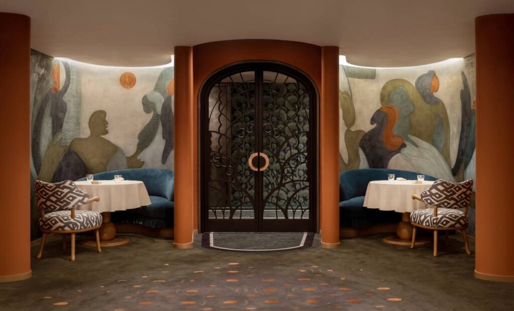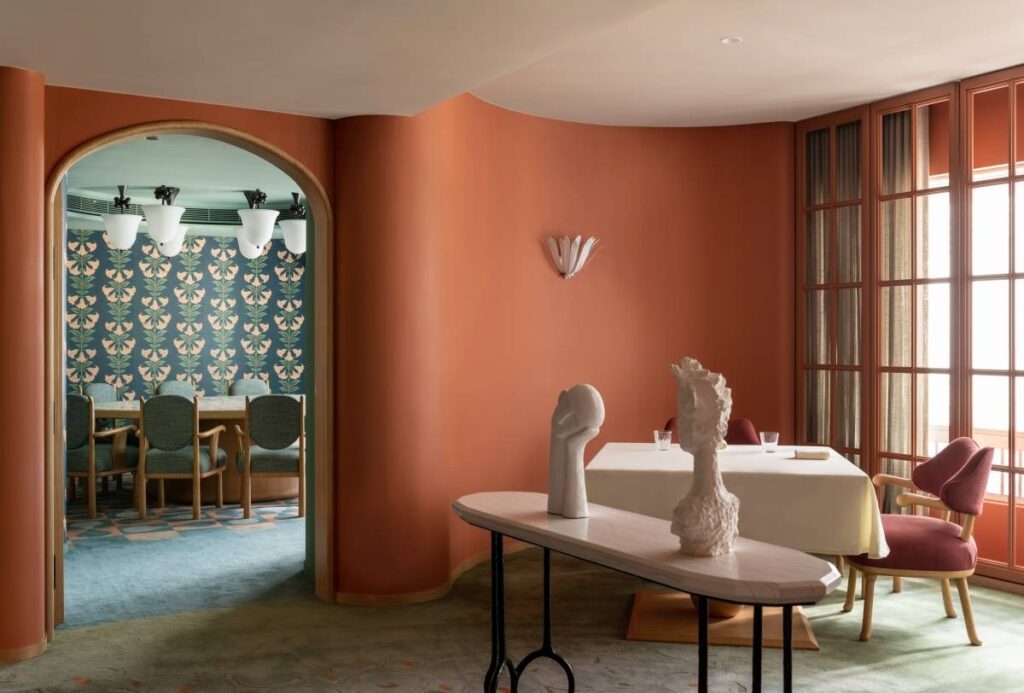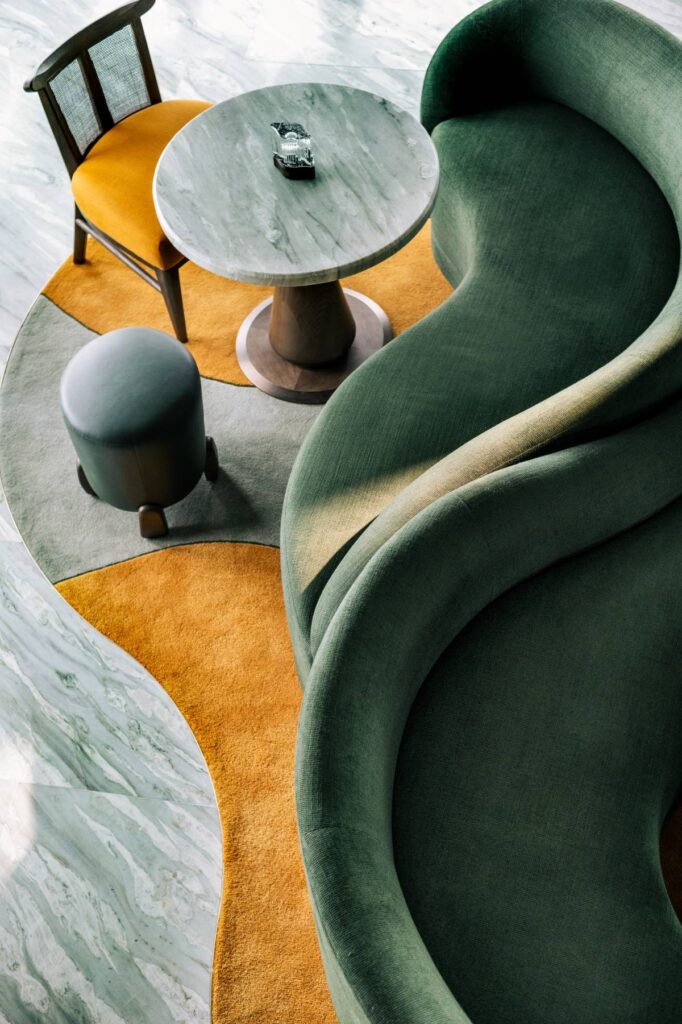 在孩童時期饒有興味地繪出迷宮讓同學解密,傅厚民如今的設計作品也像是一個個極富趣味的謎語,當你拆解和品味細節,方知藏在其中的,貼合場景所處人文氛圍的設計符碼。比如,在為Estro高端食肆構思室内設計時,傅厚民將餐廳主厨Antimo Maria Merone的家鄉——義大利那不勒斯作為靈感來源。呈波浪狀的墻體等曲線的運用,以及充斥空間的赤土色、灰綠色與綠松石藍色,致敬那不勒斯老城奢華會客廳(Salotto)傳統風尚,同時散發出一種溫暖明艷的氣質,讓人自然地聯想到那不勒斯的海灘、植被和陽光。即使被香港中環的車水馬龍包圍,在Estro用餐的人們似乎都會產生一種置身那不勒斯的錯覺。同時,Elsa Jeandedieu藝術工作室創作的略帶曖昧感的舞蹈剪影畫為空間增添幾分現代感。新舊在此交匯,傳統與現代融合,身處Estro其中,令人感到身心與環境的關係也達到了最佳平衡。這大概便是傅厚民所嘗試闡述的,奢華設計並不等同於雕欄玉砌,而是一種抽象的感知,一種令人感到放鬆舒適的體驗。