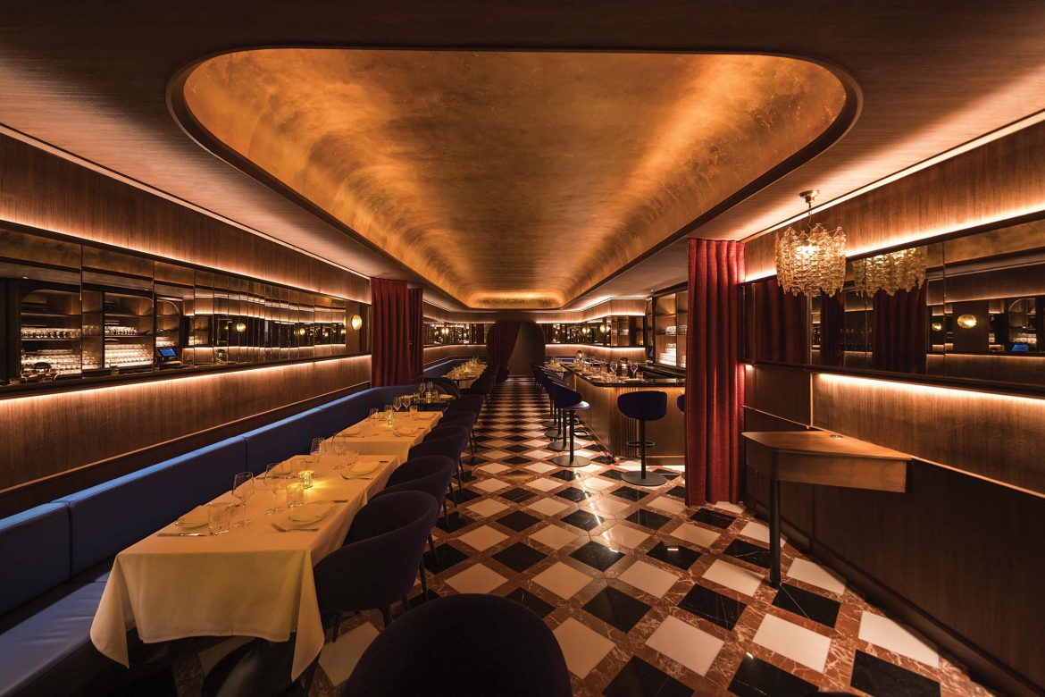 餐廳的裝潢設計巧妙運用昏暗的燈光,喚起永恆和懷舊的情感,塑造出奢華而優雅的氛圍。從意大利迪斯可音樂到復古設計風格,Bar Prima精心打造了一個彷彿永遠存在的空間。在餐廳內部,意大利Murano手工製作的琥珀玻璃幕牆的溫暖光環迎接客人,白色桌布和金箔天花板相得益彰,營造出精緻迷人的氛圍。