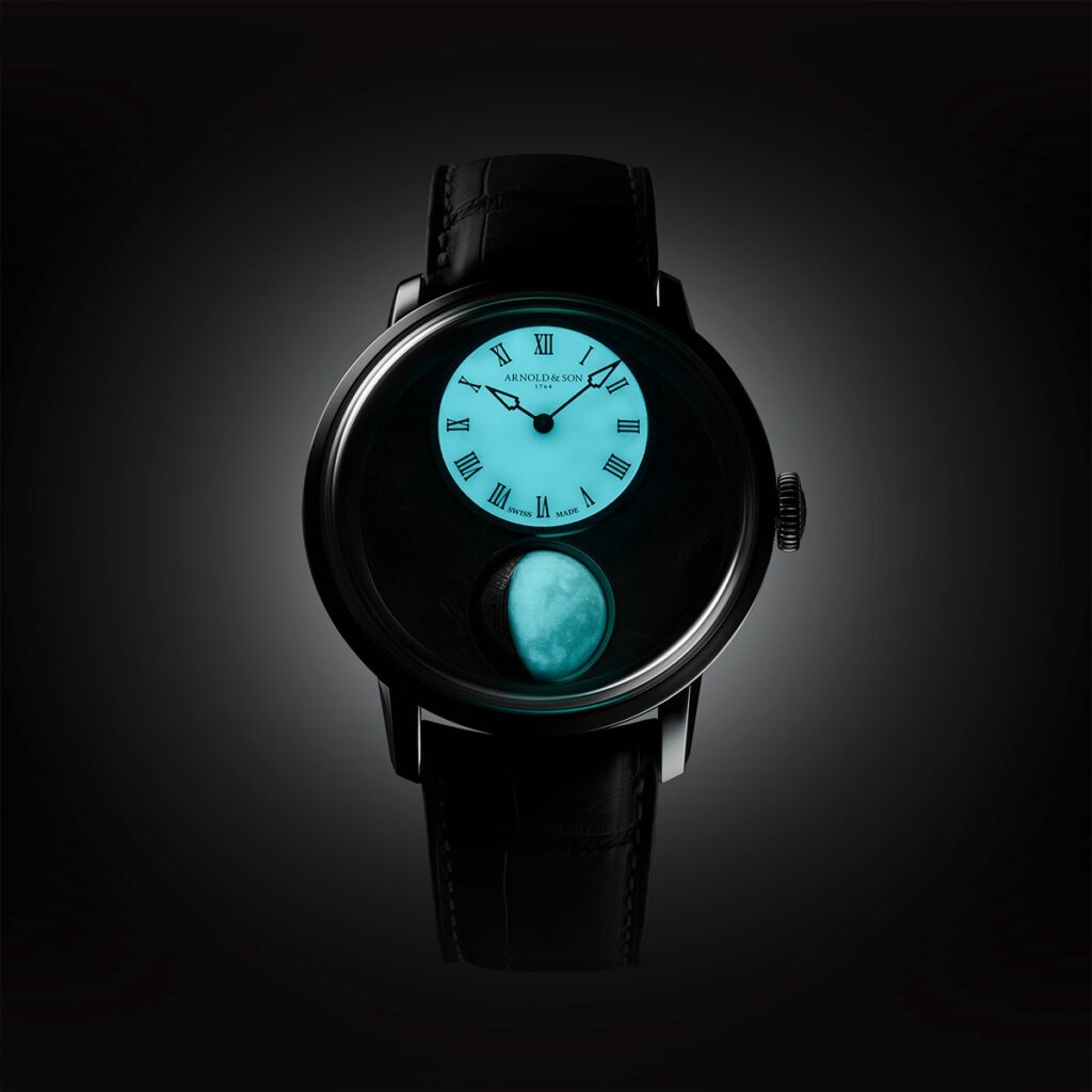和去年Luna Magna相比,今年新款的區別主要在於錶盤和月相暗部的材質全部以隕石打造,這不僅僅讓外觀呈現出古樸自然的隕石金屬風格紋理,也無比契合月相主題——天外飛星,皓月當空,這是我們在夜晚最期待可以看到的宇宙餽贈。而這款腕錶在「天外飛星」的呈現上沒有讓我們失望之外,「皓月當空」的呈現也相當驚艷。展示時間的副錶盤和代表月球亮部的蛋白石都添加了Super-LumiNova夜光塗層,在黑暗環境下,碩大而又3D感十足的月球懸浮在一片黑暗之中,上方是同樣熒光閃爍的錶盤在滴答著時光,若有幸得以親眼觀賞,那種無與倫比的美感和月相與時間共行的意境會瞬間帶我們進入一種空靈的境界。也許你會讚歎蒼穹之無垠,也許你會感歎時光的流逝,也或許你只想放空自己,想象著自己超然於物外,面朝廣寒,坐擁星河……唯獨我們會暫時性地忽略這款腕錶本身的精雕細琢,巧奪天工,這種俗事怎比得上這一片意境浩渺!
