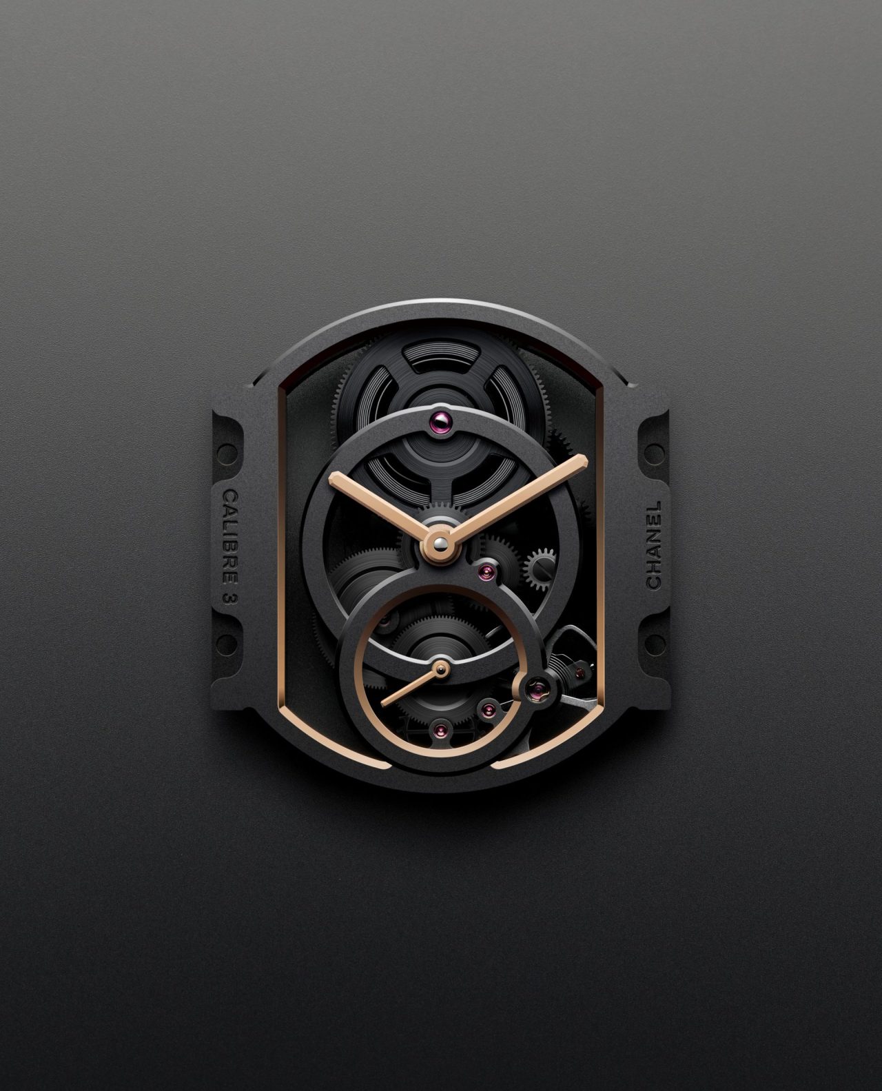 如今搭載鏤空機芯優雅回歸。全新的 Calibre 3 是香奈兒生產的第三款自製機芯。2016年香奈兒生產了 Calibre 1,裝備在香奈兒第一款男式腕錶 Monsieur de Chanel 中,次年推出的 Calibre 2 則用於女式腕錶 Première Camélia Skeleton。