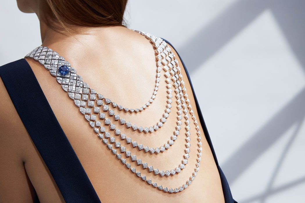 菱形圖案別具一格,鑲嵌鑽石的輪廓格外精巧雅緻。天藍寶石和海藍寶石錦上添花,與白金和鑽石的耀眼光輝形成視覺對比,瑰麗閃爍。珍珠、細工鑲嵌的灰色珍珠母貝,以及水晶各具風華綺麗,但異曲同工又襯托出這一系列的精髓。