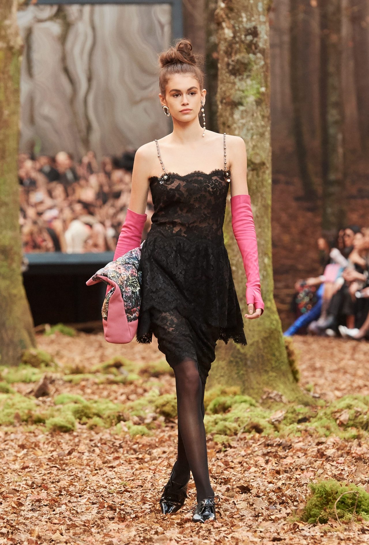 經典的小黑裙系列在晚間將經典與精緻推向了極致。你永遠不要低估經典的魅力,不論是清純的小黑裙還是嫵媚的蕾絲吊帶裙,都讓人們的視線無法轉移。透明的刺繡薄紗與黑色蕾絲的結合,讓黑色的禮服多了一份優雅與嫵媚。皮革材質覆飾蕾絲,垂褶袖小黑裙或褲裝,以及肘部的多層褶飾都十分搶眼,為 CHANEL 的秀場勾勒出另一種復古的浪漫與優雅。