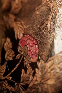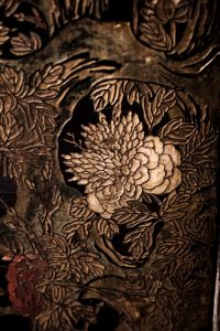 東方烏木漆面屏風上的花卉圖案。作為中國傳統十大名花之一,山茶花素有花中珍品之稱。其花型秀美,艷麗多彩,被喻作「似有濃妝出絳紗,行光一道映朝霞」,而因其花期久長,又贏得了「雪裹開花到春晚,世間耐久孰如君」的讚譽
