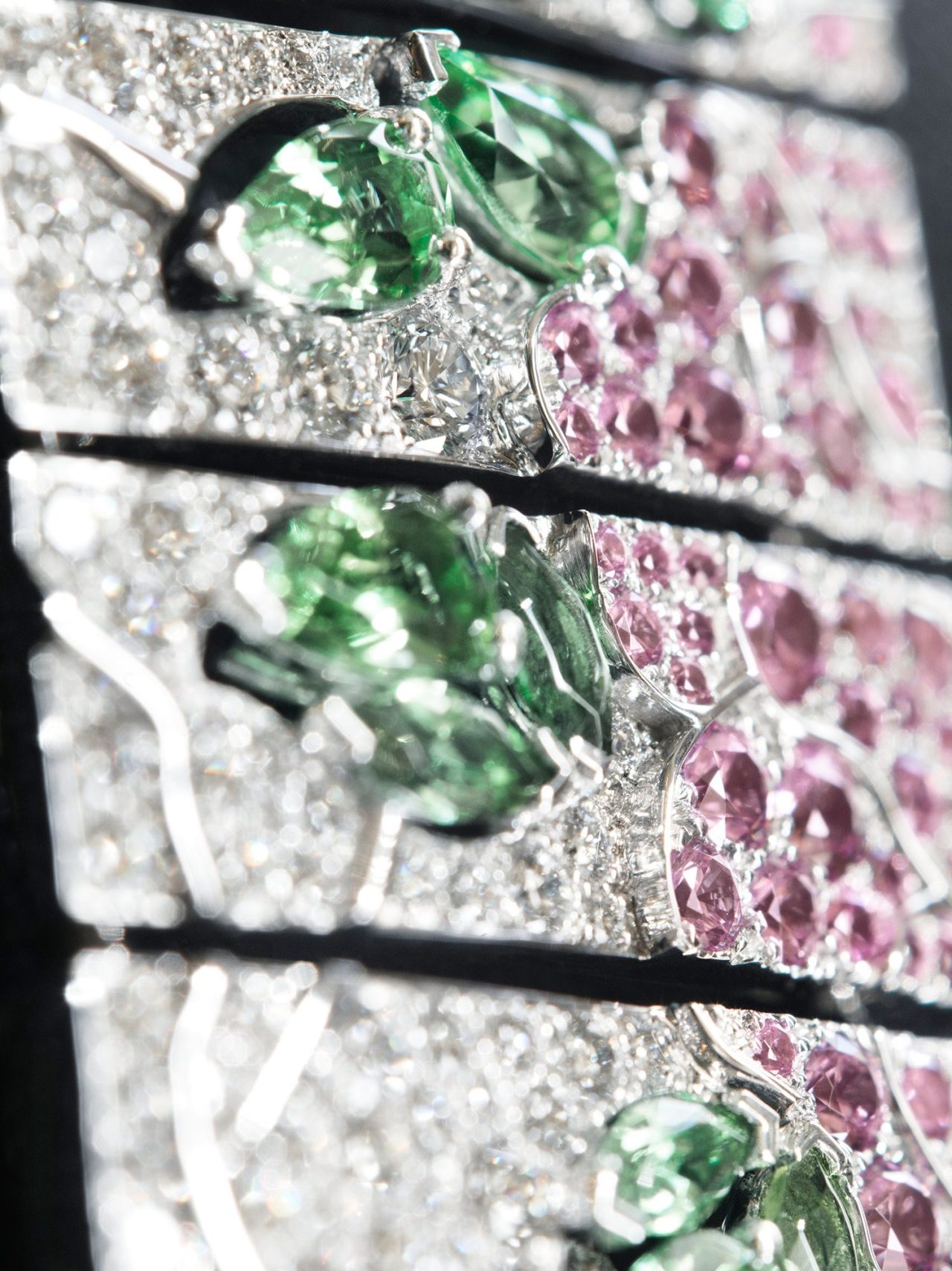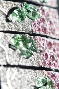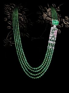這條項鍊由四排綠碧璽珠串成,每一顆均由手工雕刻而成,深淺綠色漸變起伏,給人一種春意盎然的生動感。項鍊一側是無色鑽石鋪鑲而成的屏風造型,屏風分作七扇,或相連,或間隔。屏風圖案為粉紅藍寶石綴成的山茶花瓣與綠碧璽構成的葉片,色彩明媚。屏風上方是一顆重達30.55克拉的枕狀切割薄荷綠沙弗萊石,色澤純粹剔透,令人讚嘆。整件飾品雍容華美,帶有明顯的古典東方韻味。