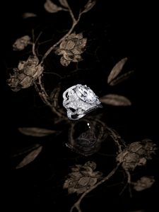 這枚白金鑽戒戒面採用鏤空設計,鑲嵌鑽石勾勒出山茶花花瓣與葉片, 正中是1顆8.88克拉D色內部無瑕 Type IIa 橢圓型主鑽,光彩耀人,令人矚目。
