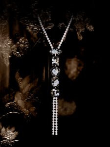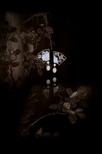 這款Y型項鍊由86顆日本養珠串成,中間的5個鍊墜分別為扇形、箭形、花形、八角形及圓形的中國傳統花窗造型。鍊墜以黑漆為底,主體圖案是珍珠母貝打磨成的花瓣,中央鑲嵌一顆形狀各異的鑽石,分別是0.70克拉橢圓形切割鑽石、0.70克拉馬眼形切割鑽石、0.70克拉圓形切割鑽石、0.70克拉枕形切割鑽石和0.71克拉梨形切割鑽石。鍊墜上下相連,恰似一套形態各異的微縮烏木屏風,古香古色,小巧玲瓏。