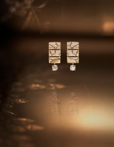 這對18kt黃金鑲鑽耳墜,左右耳造型對稱,由三個迷你四方屏風自上而下疊成,以鏤空和拋光金線勾勒出山茶花局部圖案,再以無色鑽石雪花鑲嵌,璀璨耀目。耳墜末端懸掛一顆圓形切割鑽石,為方形的整體設計增添了圓潤與動感。