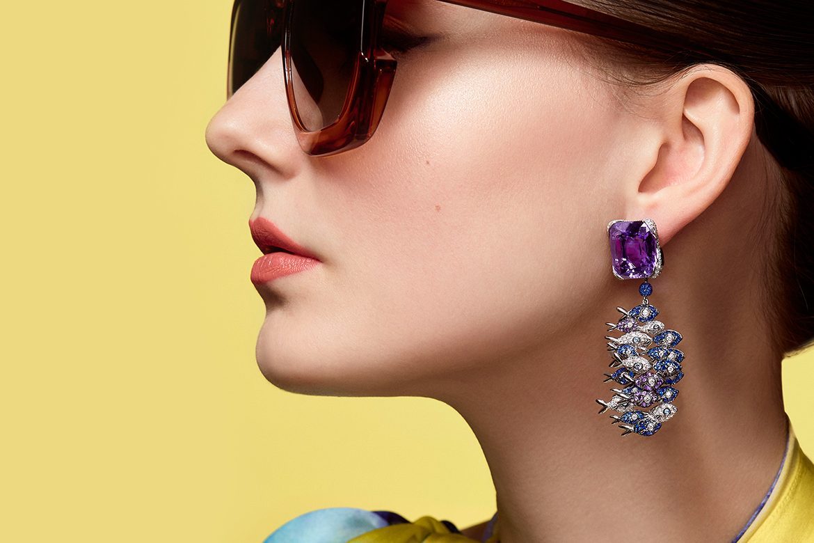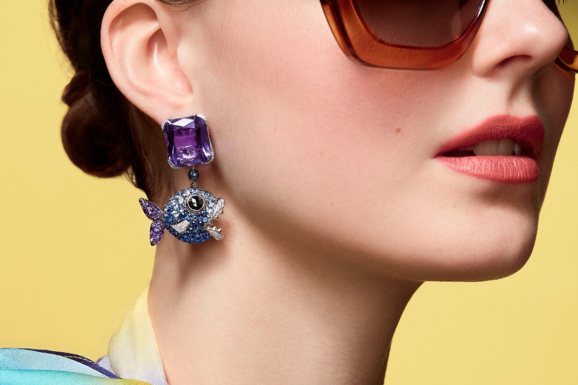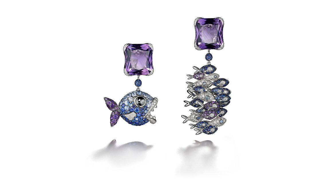系列中最具趣味的當屬這對魚群主題的白金耳墜。兩枚耳墜上方各鑲嵌了一顆超過10克拉的方形切割紫水晶,而下方則採用了不對稱設計——一枚墜有藍寶石與紫水晶鋪排的「水虎魚」,大嘴尖齒,貌似凶猛實則憨態可掬,其中魚目採用的正是帝緻最有代表性的黑鑽﹔而另一枚則垂落著10多條白金小魚組成的魚群。兩相對照,分明就是以多彩寶石重現海洋中魚群逐食的場面,生動傳神,充滿童趣。
