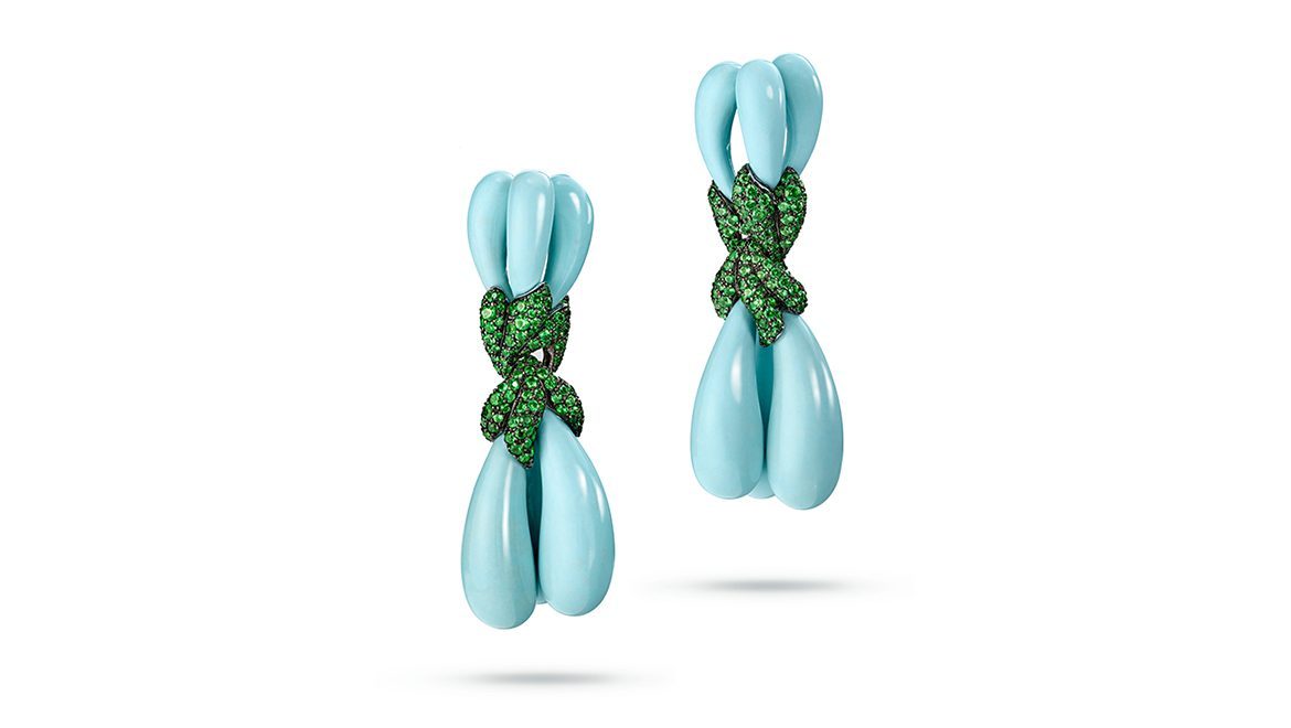 Melody of Colours 系列的又一特色,在於其造型設計上匠心獨運,將不同大小、切割、顏色及品種的寶石,揮灑自如的排列组合,令整件珠寶猶如穿戴身上的華貴雕塑,形成豐富立體的視覺效果。例如這款耳墜,帝緻有意將綠鬆石打磨為略帶弧度的水滴形輪廓,讓寶石之間緊湊貼合,而中間的鑲座特別設計為立體的螺旋結構,點綴晶瑩的綠色沙弗萊石,這一別出心裁的設計將綠鬆石之柔潤與沙弗萊石之璀璨巧妙融合,並給人耳目一新的靈動之感。