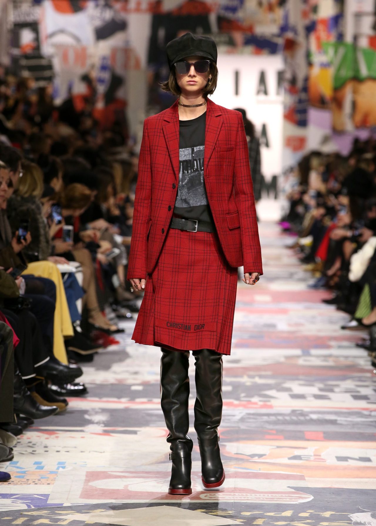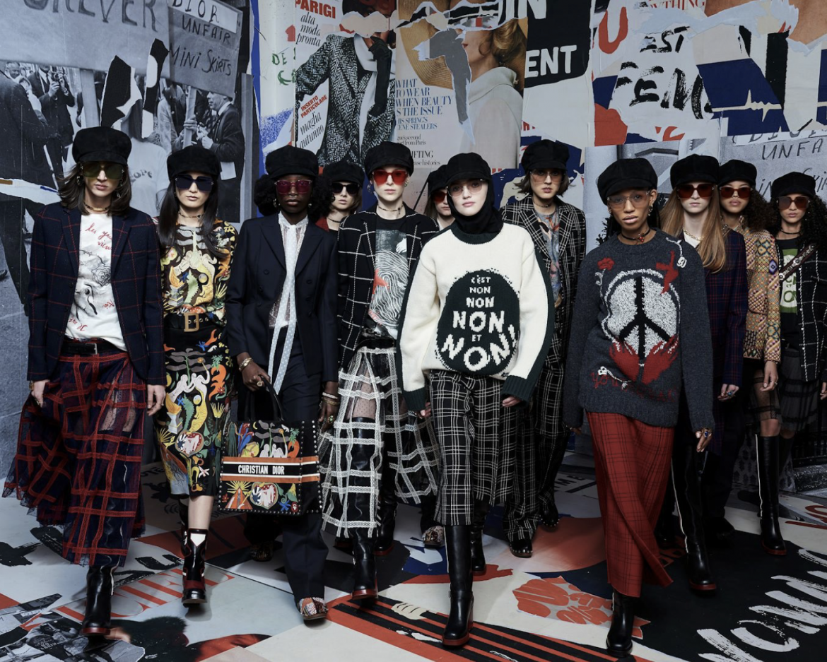 50年後的今天,Chiuri 藉由60年代的女權社會運動背景,精心策劃了這次 Dior 2018/19 年秋冬時裝秀場,把時尚的執念轉化為革命性時代的信念。以滿滿的懷舊復古的社運海報裝飾著整個秀場——從牆壁、階梯到看台,全都是半被撕毀的海報,像是剛經歷一場革命運動,巧妙地暗示了時尚與歷史文化息息相關。