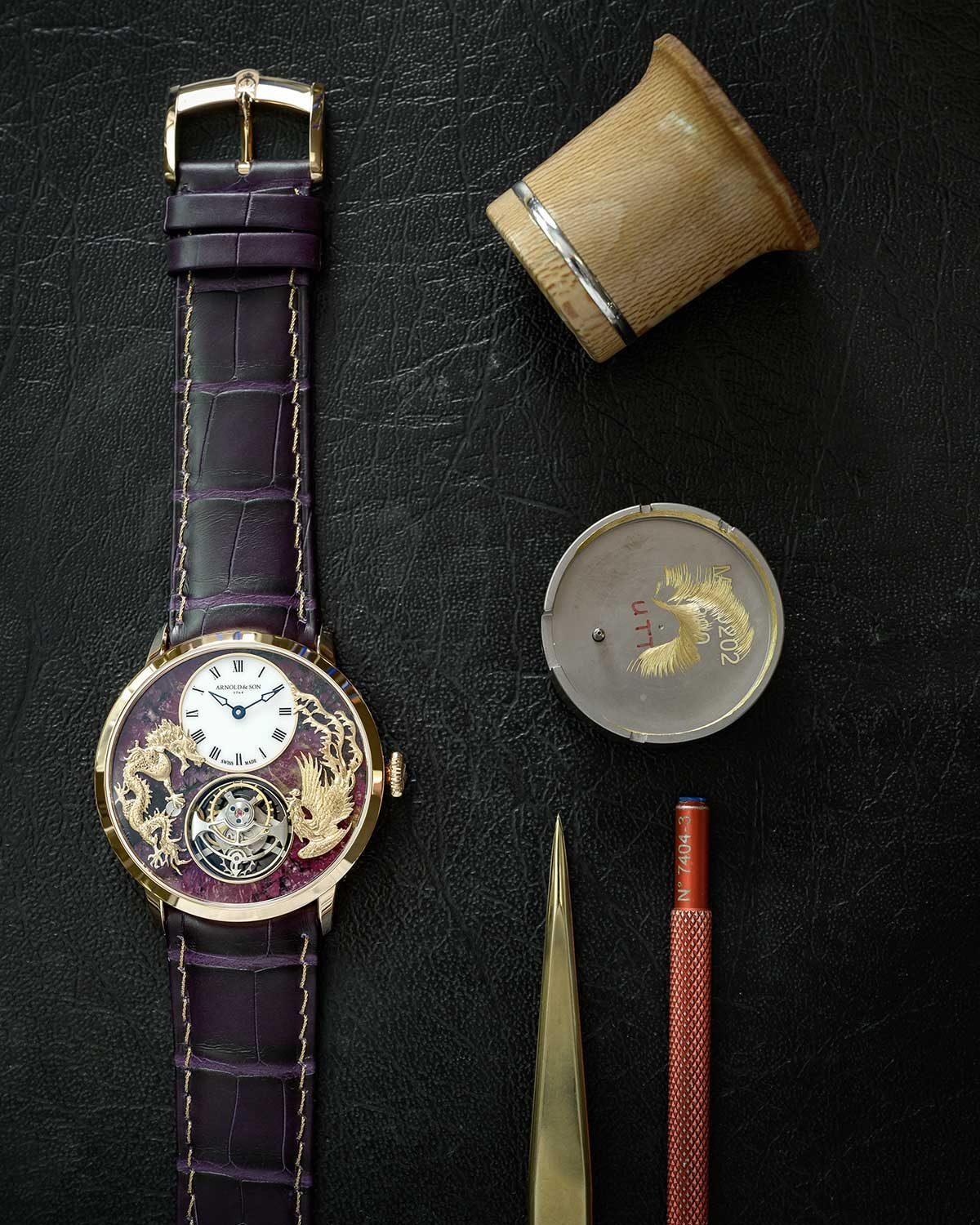 當然,這款龍鳳戲珠腕錶並不只是擁有華麗至極的外表,其硬石錶盤下是雅諾自製A&S8200機芯,它是當今最纖薄的陀飛輪機芯之一,厚度僅有2.97毫米,而它的動力儲存卻達到了陀飛輪手錶中極為罕見的90小時。同時,它的後蓋部份也是鏤空設計,佩戴者不僅可以細細品味錶面上細緻入微的龍鳳雕刻造型,也可觀察陀飛輪橋板精細的鏤空工藝和其後橋上的手工雕刻,在把玩手錶的過程中又增添了幾分樂趣。