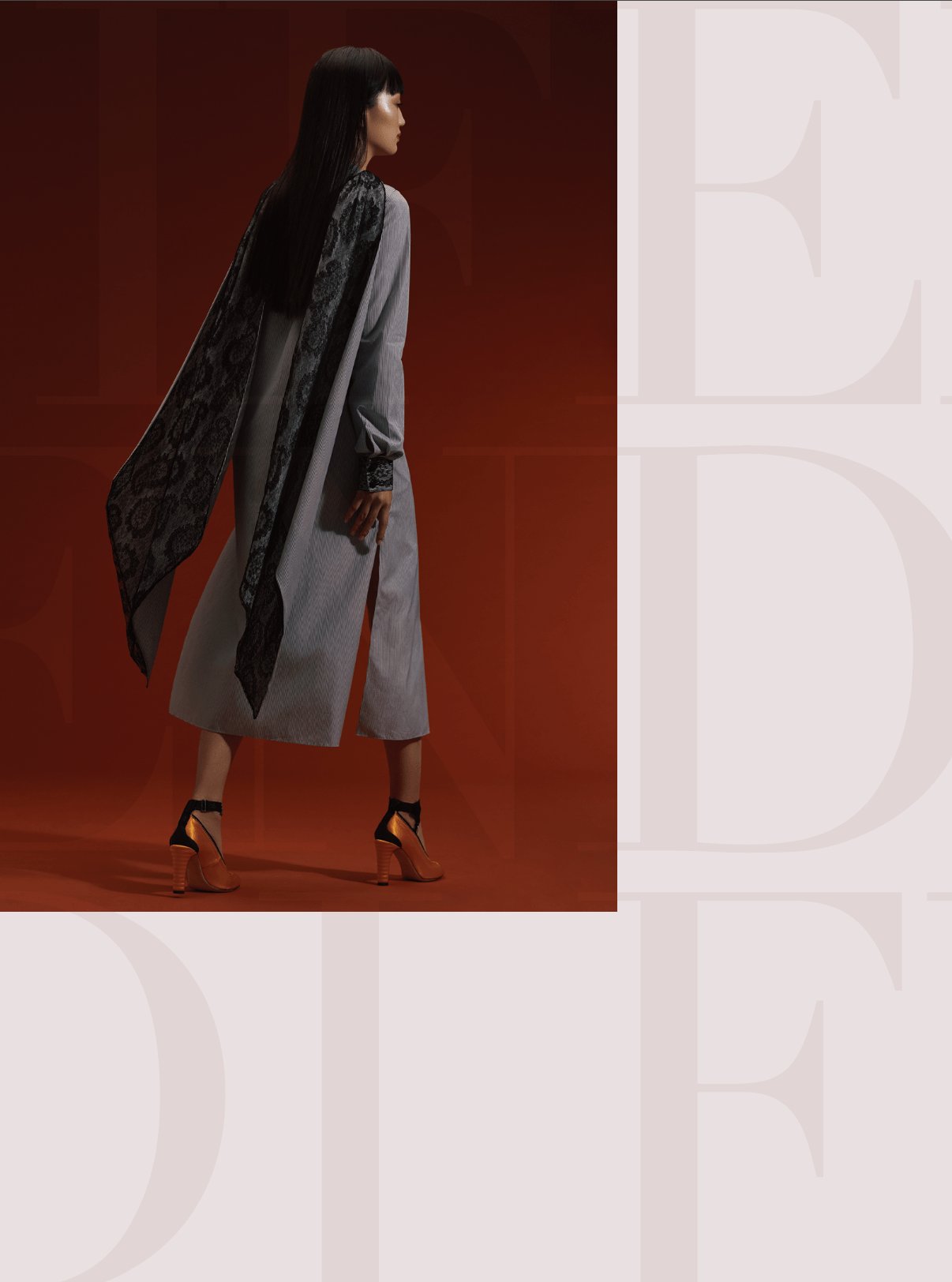 直剪式連衣裙開叉下擺與大圍巾衣領在活動時為整體造型注入動感。黑色尚蒂伊蕾絲、佩斯利花紋裝飾盡顯細節藝術。