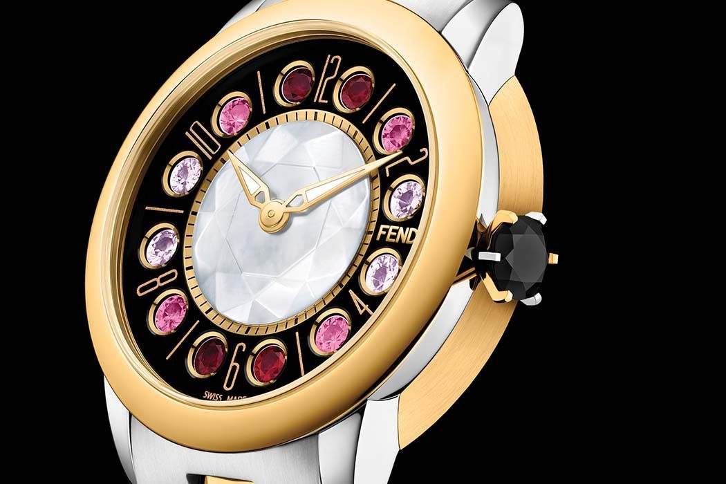 全新Fendi IShine系列結合高貴材質與貴重寶石巧妙翻轉光影,展現品牌的頂尖工藝和專業技術。只要旋轉3時位置飾以爪鑲寶石的錶冠,便能讓三種不同寶石組合輪流現身:12顆白色拓帕石、12顆粉色及紅色漸層拓帕石,或是12顆黑色尖晶石,為錶盤上的阿拉伯數字與時標帶來璀璨光彩。Fendi IShine的設計新穎而大膽!