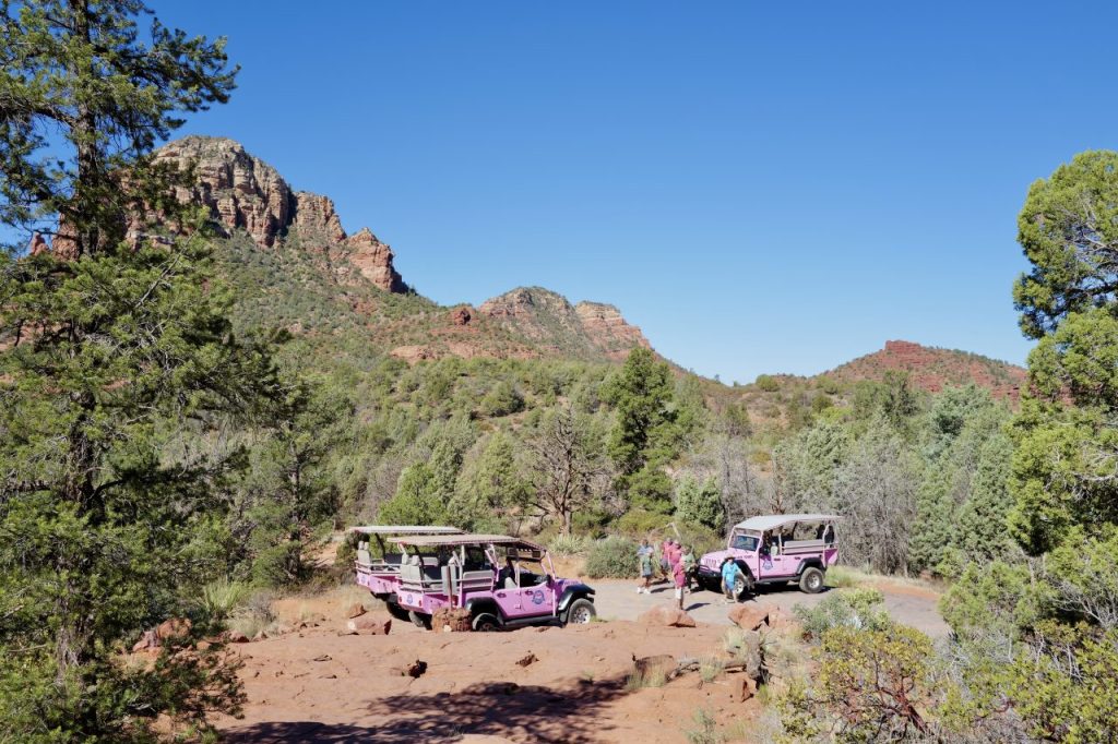 第二天清晨,我們參加 Pink Jeep Tours 的「破箭小徑」探險。這家公司擁有該區獨家路線,由專業導遊領路,帶我們在紅岩間驚險穿梭,近距離領略塞多納的壯闊。下午,我們放慢腳步,來到 Tlaquepaque 藝術與購物村散步。這裡像個迷人的西班牙小鎮,處處是藝廊、手工精品店,石板小徑則被古老的梧桐樹蔭覆蓋,氣氛悠閒。晚餐我們選在 Mariposa Latin Inspired Grill。當夕陽沉入紅岩之後,整座山谷被染上了一層橘金色光芒。餐廳的玻璃牆就像一個巨大的畫框,把這最動人的景色收了進來。這裡的菜餚設計大膽且充滿生命力,完美體現了沙漠的熱情與靈魂。