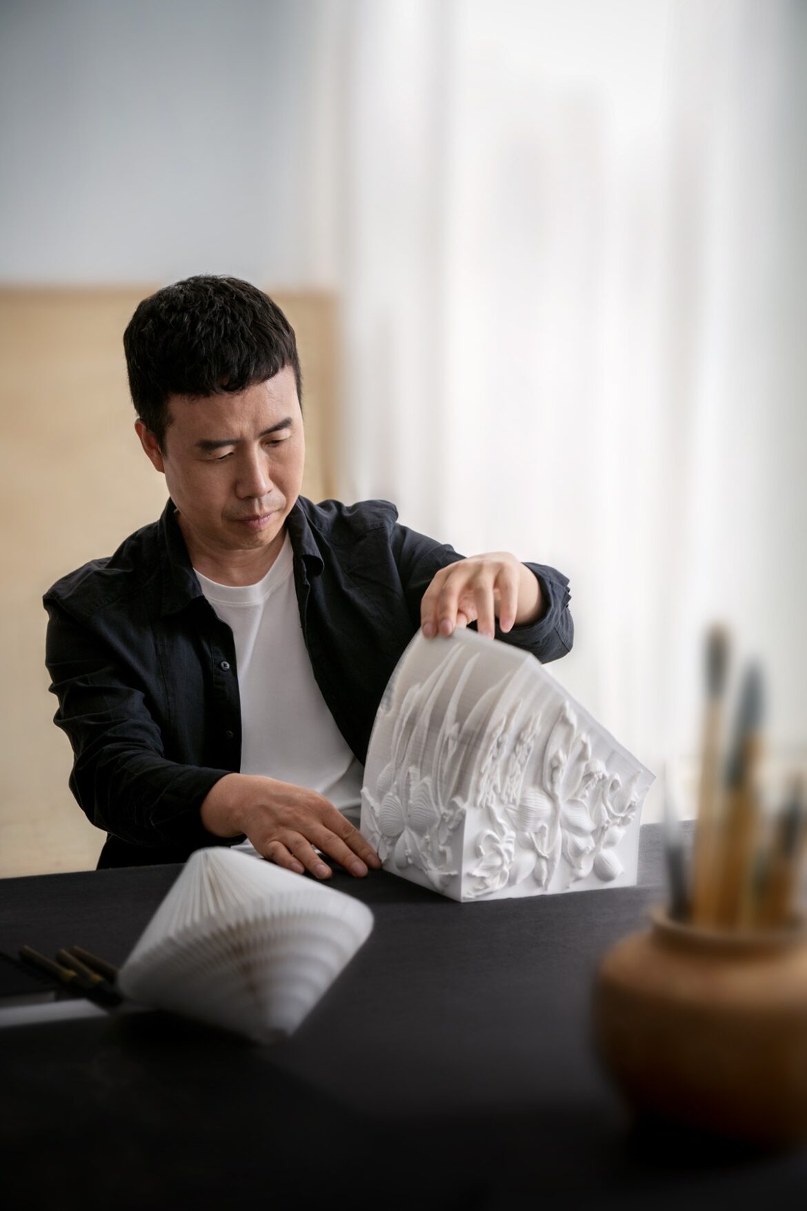 中文語境時常將人生比喻成紙,年華流逝,我們每個人在紙上書寫屬於自己的故事。感嘆生命有時像是紙張一樣脆弱,然而它又時常展現出堅不可摧的能量——就像是上千張紙緊密曡在一起。中國當代藝術家李洪波以紙為媒介,聯手嬌蘭(Guerlain),精心打造限量版紙藝雕塑基座,用於裝載御庭蘭花黑蘭鑽極萃乳霜(Orchidée Impériale Black The Cream),他構思的花卉圖案則被印於法國瓷器名家柏圖工廠(Maison Bernardaud)燒製的陶瓷容器之上,以抗衰老能力聞名的黑蘭鑽極萃乳霜,由此也成為一件歷久彌新的精緻收藏品。