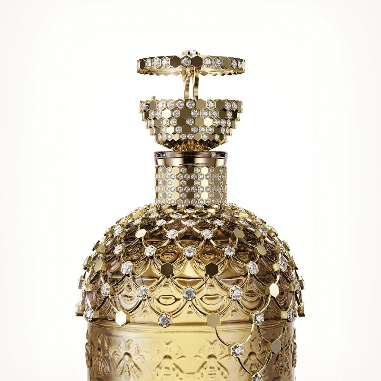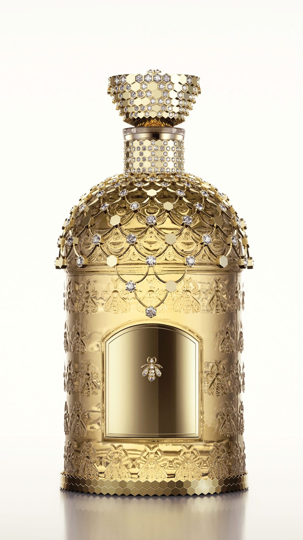 如今,近兩百年後,嬌蘭和尚美巴黎再次交會,共同創作了名為「宮廷花束(Bouquet de la Cour)」的特別版瓶身,以紀念蜂印瓶誕生170週年,是全球僅有的孤品。這個香氛瓶如同一套華麗的衣袍,精緻的瓶頸和華貴的瓶肩被鑿刻成金色蜂巢,就像一件護胸甲,藏有無數秘密。這華麗的斗篷被工匠的巧手點綴著658克的黃金和336顆總重達55克拉的圓形鑽石,閃耀著華美的光芒。