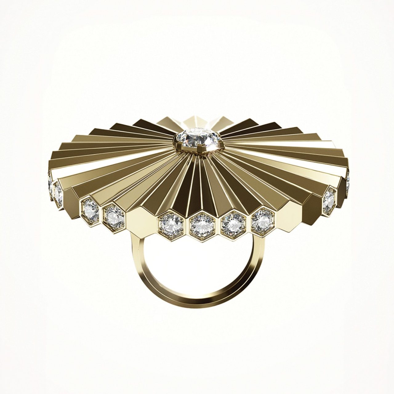 更令人嘆為觀止的是瓶蓋內的秘密,那枚絕美的戒指,宛如蜂印瓶的皇冠,鑲有一顆華麗的兩克拉鑽石,這戒指可獨立佩戴。它的設計巧妙,側面有一個按鈕,輕按按鈕,平整的表面便會分開,露出一個太陽環,反射著每一道光線,彷彿一顆耀眼的星星。
