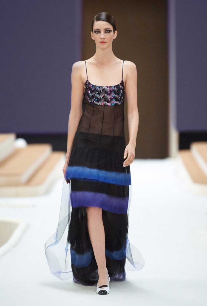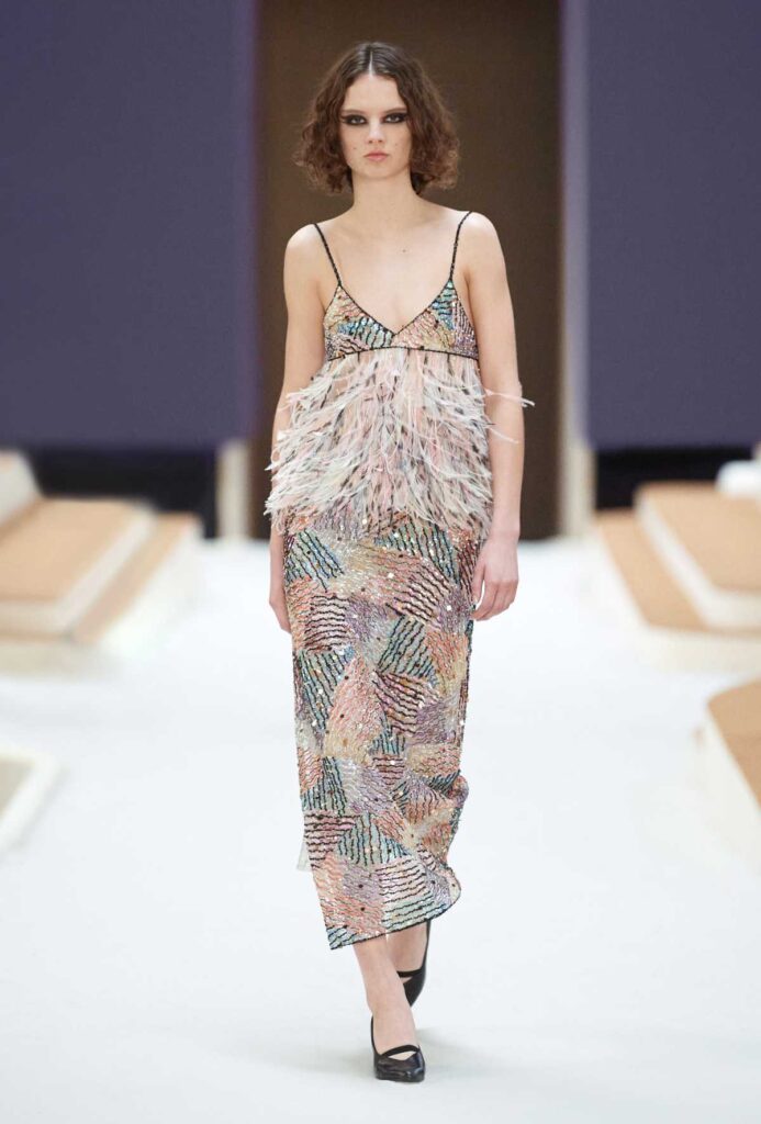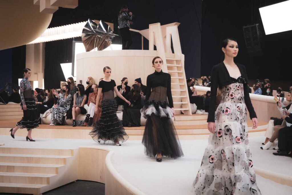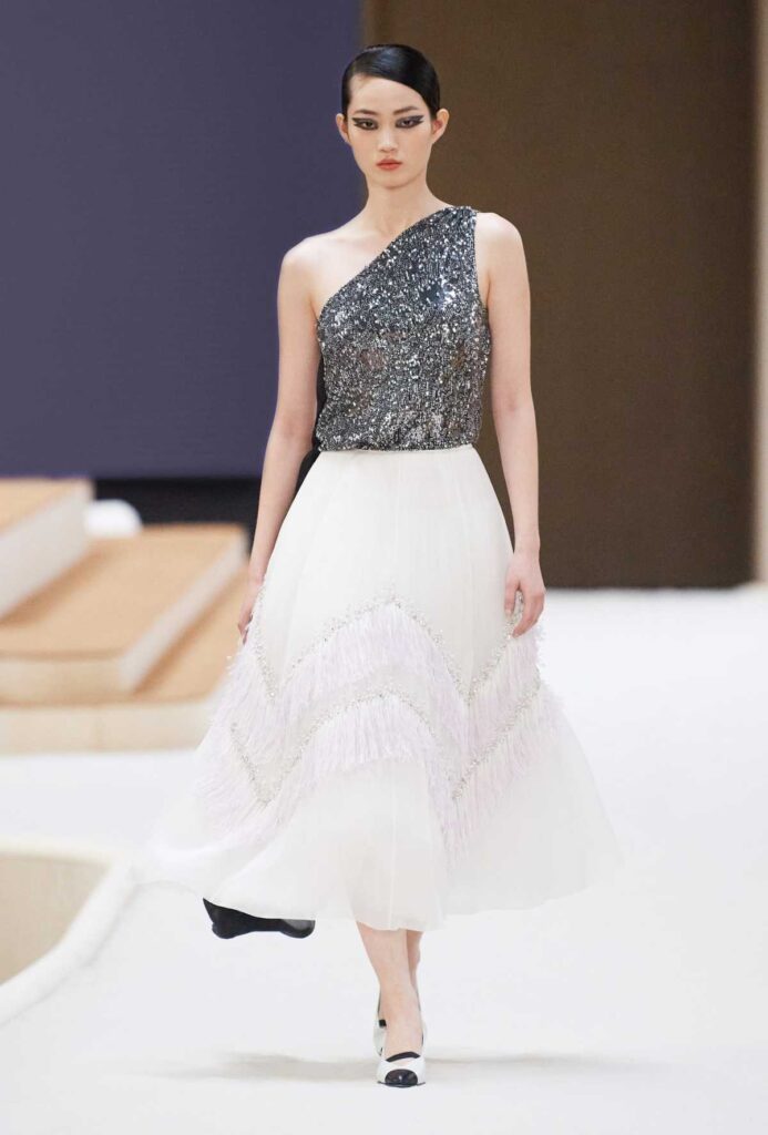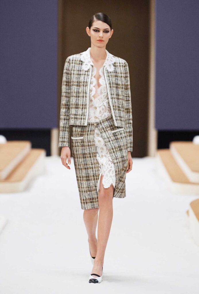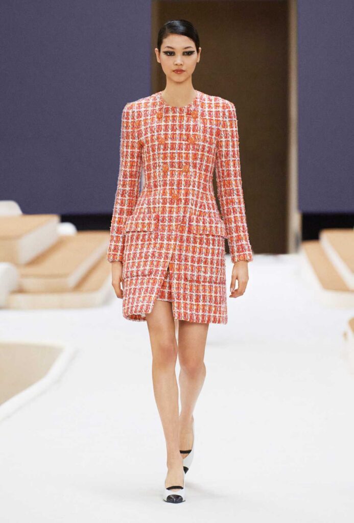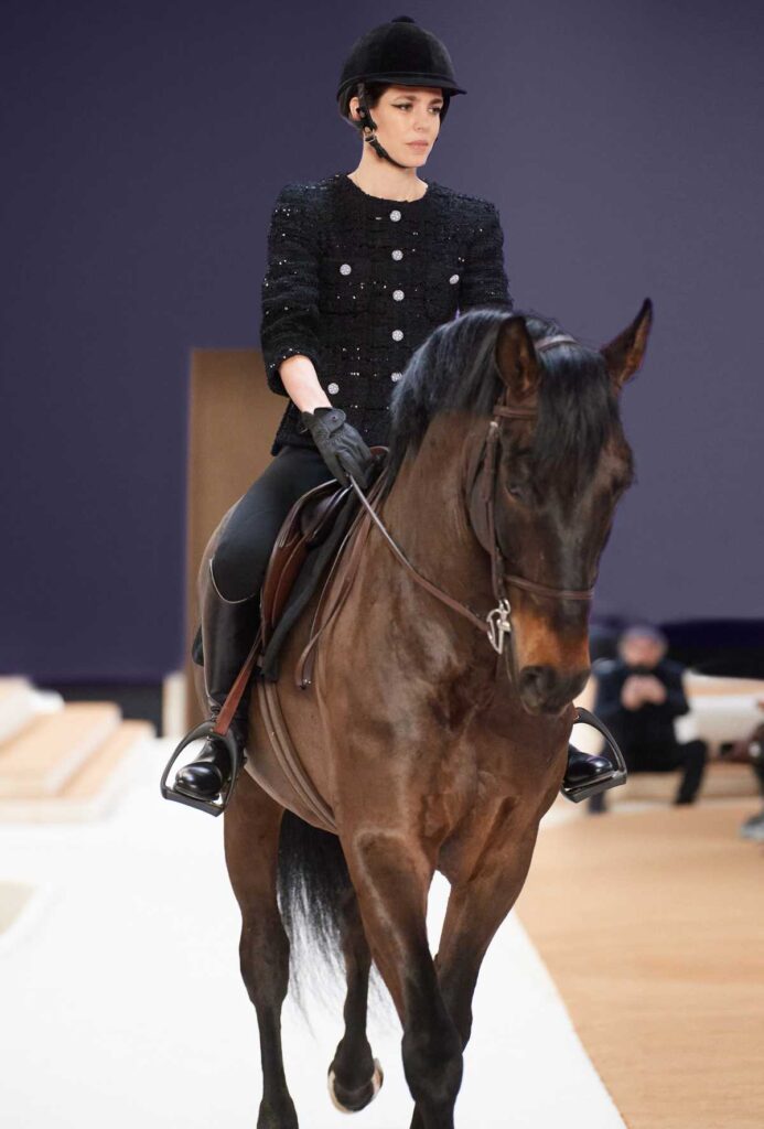 伴隨初春的清風暖陽,她灑脫而優雅地向你走來——這是香奈兒2022春夏高級訂製給人的整體印象。Virginie Viard特邀藝術家Xavier Veilhan打造出大量運用幾何圖形和金屬材質的現代主義秀場,這也激發Viard創作出結合香奈兒一貫以來的優雅和輕盈靈動氣息的設計。流蘇、薄紗、亮片刺綉、蕾絲、粉紅色斜紋軟呢結合白色條紋等等,繪製出一副春日野餐般歡樂圖景。Charlotte Casiraghi穿著鑲亮片黑色羊毛斜紋軟呢外套騎著馬兒開場,呼籲整個系列率性自由的主題。