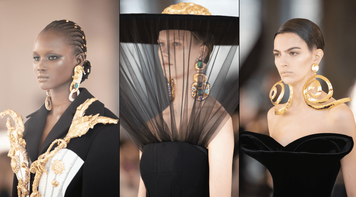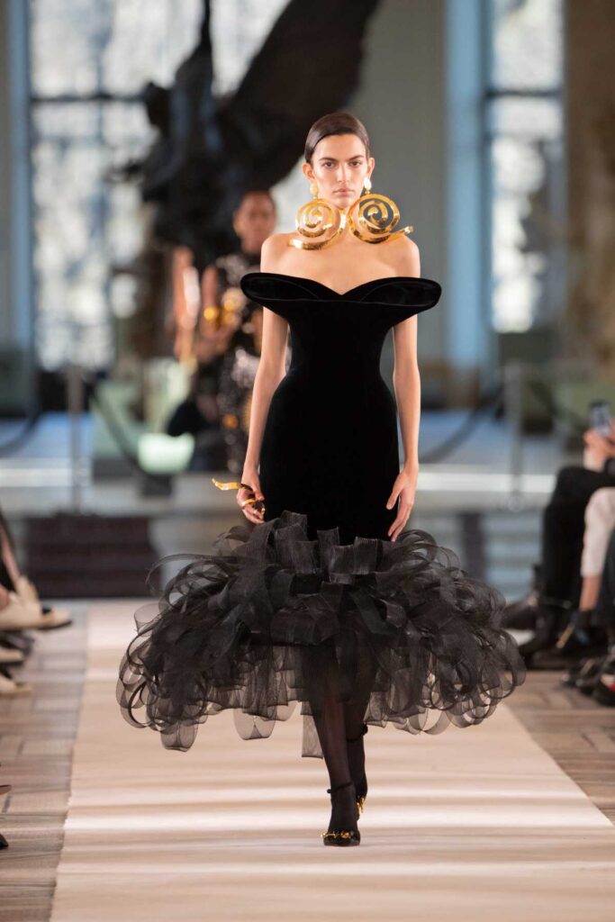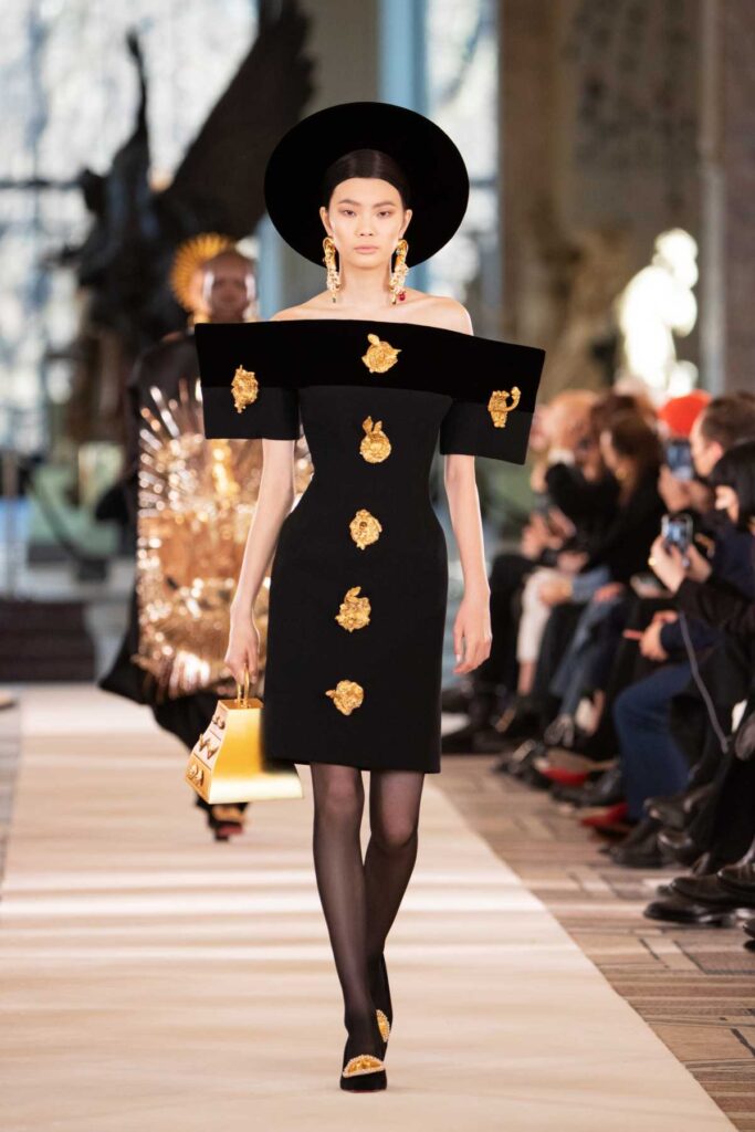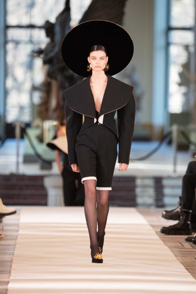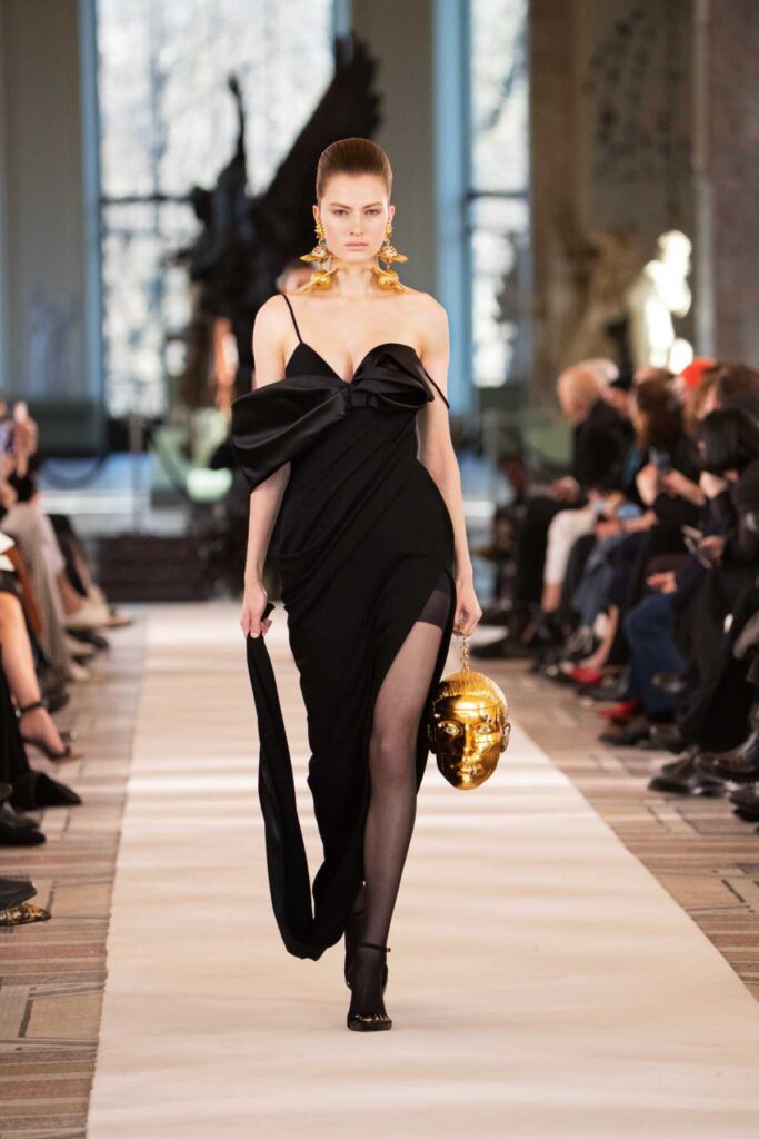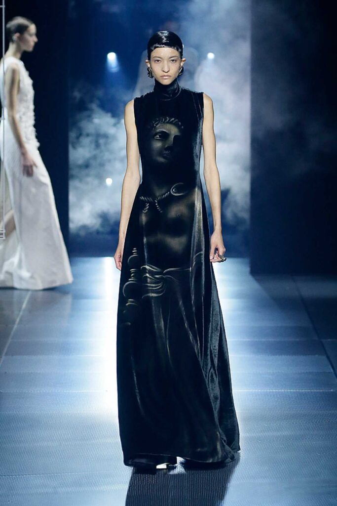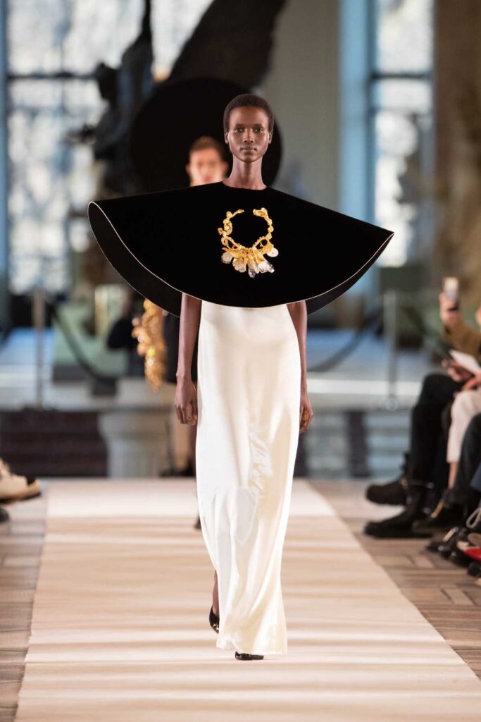 只用黑、白、金三個簡單色調貫穿整個系列,Schiaparelli藝術總監Daniel Roseberry卻打造出了一個仿佛是結合了巴洛克式浮華與古典神話高雅格調的世界。疫情時代展開兩三年,我們的生活處於不斷的變化中,一切都如此不確定,日常生活好像都成為了一種超現實。在這樣的背景下,Roseberry開始重新審視時尚的意義,他摒棄了上一季高級訂製明艷的色彩和過分張揚的輪廓,試圖通過黑白金三色結合更收斂的設計,創造出同樣震撼人心的視覺效果,秀場模特們仿佛化身兼具人性和神性的女祭司,洞察著人世間的一切。Schiaparelli這季高訂系列告訴我們,回歸本源並不代表寡淡和中規中矩。