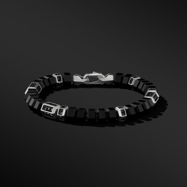 David Yurman的Hex男士珠寶系列致敬大自然中常見的六邊形——雪花、有機分子、蜂巢等等,將六邊形的簡約魅力化為潮流男士珠寶。Hex珠串手鏈將黑瑪瑙結合鑽石,陽剛而不失優雅。