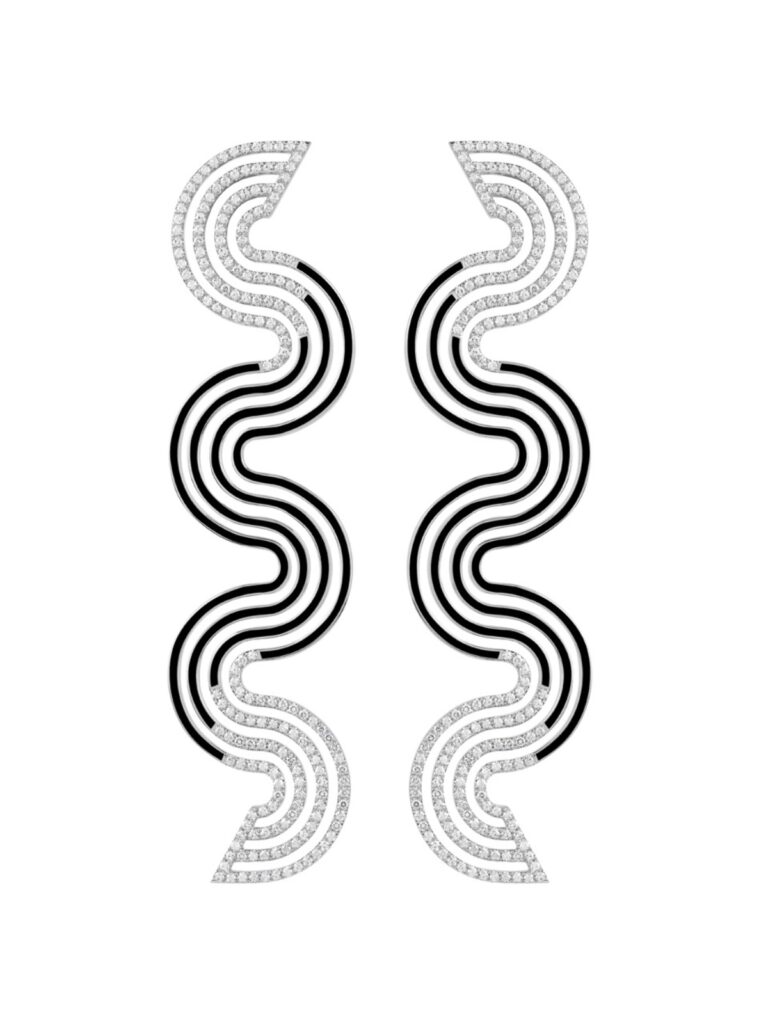 State Property的Voyager系列Aldrin 耳環僅僅用線條,便可營造出大膽不羈的個人時尚風格。鑽石和深黑色琺琅結合而成的耳環造型如瀑布一般垂於耳墜下,即使靜止也展示出一種神秘動感。