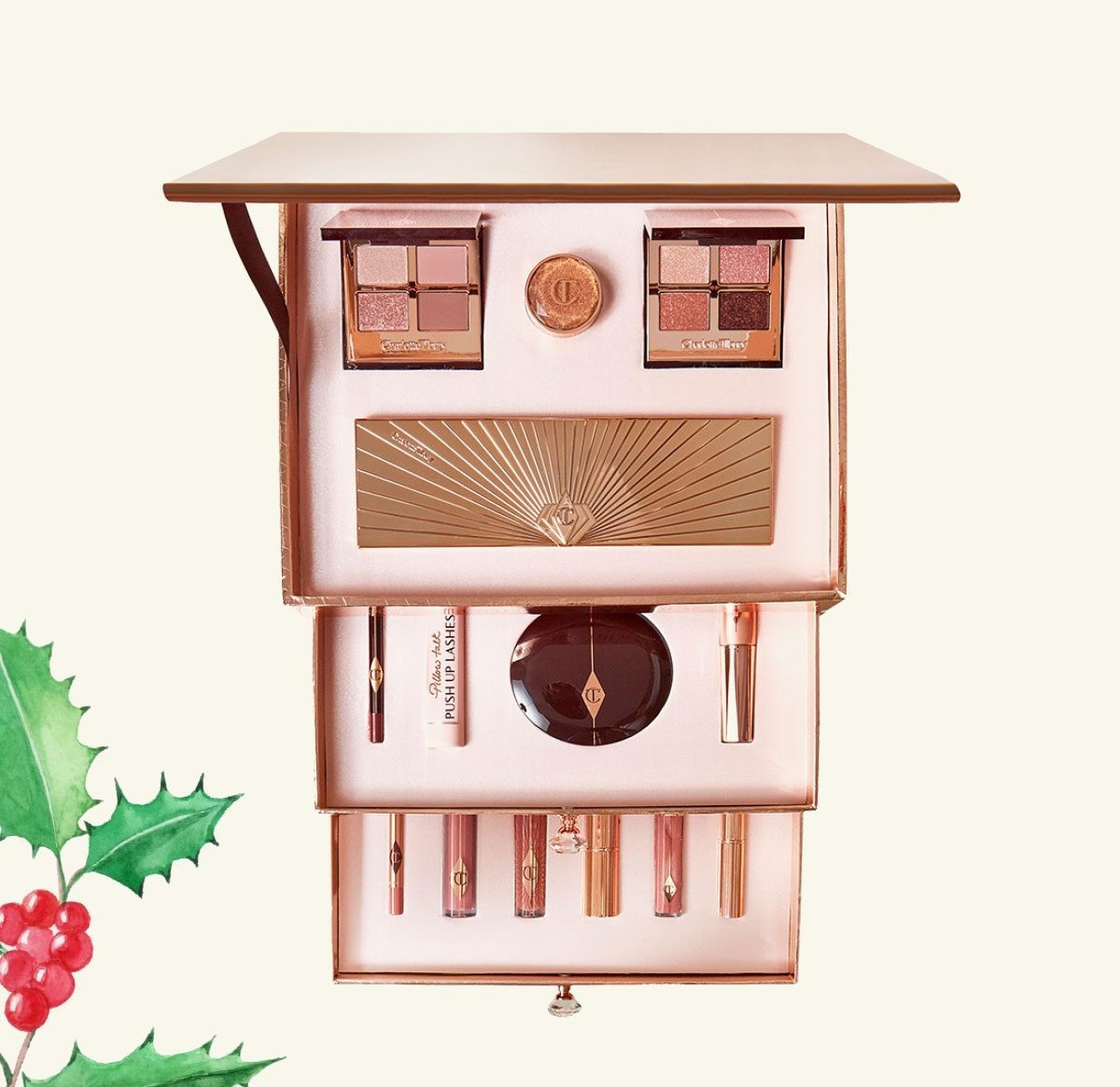 Charlotte Tilbury打開玫瑰金色的Pillow Talk Dreams Come True禮盒,便是開啓了一段幫助你尋找最美麗的自己的旅程。正如「枕邊話」這個帶有私密性且和誘惑性的名稱,裸粉色基調Pillow Talk系列彩妝總能讓臉龐的每一個角落散發浪漫的光芒。據說,這個世界每三分鐘就會售出一件Pillow Talk產品,而聖誕特別版禮盒包含14種系列彩妝,一網打盡精緻妝容所需。 |