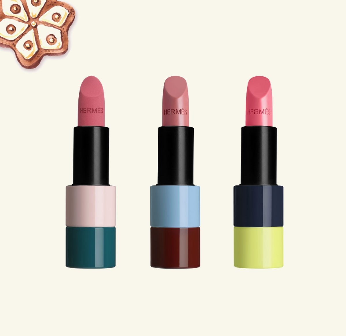 Hermès今年秋冬季,愛馬仕推出三款限量版Rouge Hermès口紅——Rose Ombré, Rose Pommette和Rose Nuit。其中兩款緞面光澤口紅及一款啞光口紅基色調均為粉色,或明艷或內斂,就仿佛秋冬晚霞鋪滿的天空所呈現的,有些相似實則各異的粉色。口紅包裝延續了此前的撞色搭配,三種色彩層疊,玩味十足。 |