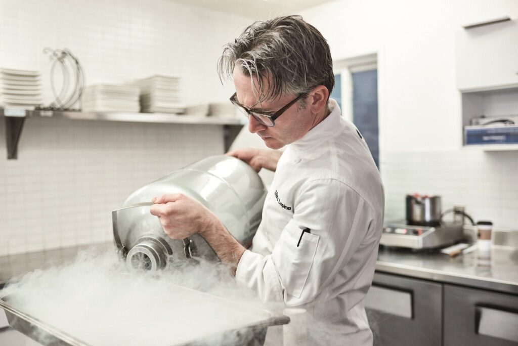 被多個媒體稱作「加拿大最富瘋狂創意的廚師」的主廚Lepine自然不是等閒之輩,熱衷跳脫框架思考的他,相當看重菜品的視覺效果。液態氮、懸吊玻璃球、互動式二維碼(QR code)等「道具」,都是他傳遞料理意象的媒介。在他的料理觀念中,風味固然重要,然而其藝術價值更值得費心雕琢。Atelier為人所知的「THRU」主廚精選系列,即如一場藏品豐富的大型料理展,他在餐廳二樓設置一處六人限定的私密環境,提供超過五十項甜鹹交織的小食,餐客(或者説觀者)需全程配合手機用餐,菜品上桌同時,以手機讀取桌面上的二維碼,以此獲取菜品簡介、製作過程影片,抑或預先錄製的電話文本,可謂一視、聽、嗅、味及觸覺五感共融的絕妙體驗。