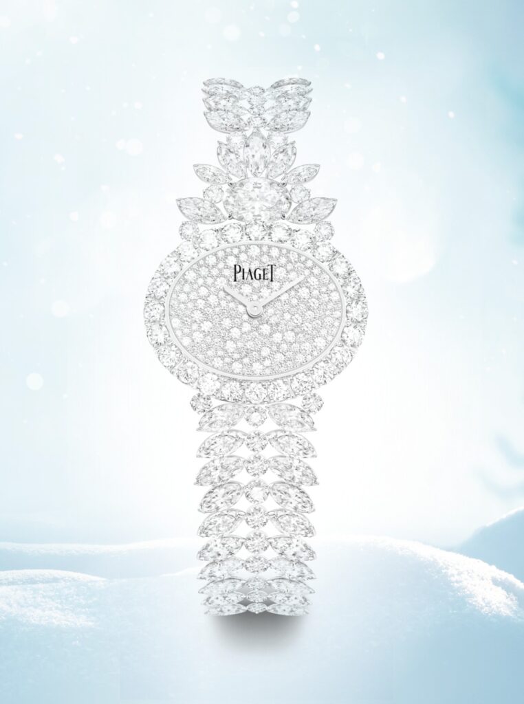 手錶上面鑲鑽並不稀奇,但鑽石裡面有一塊手錶恐怕就不多見了。相信上一句話是大多數人見到伯爵(Piaget)Treasures Watch的第一反應,因為從正面看到它的外觀時,除了指針、伯爵logo以及手錶外殼與錶盤玻璃之間的白金錶殼圓圈截面之外,入眼之處盡是鑽石,包括錶帶,都是由欖尖形、明亮式切割鑽石排列連接而成。在錶殼的正上方,甚至還有一顆約1克拉的橢圓形切割鑽石,鑲嵌在欖尖形及明亮式切割美鑽中間,構成了鮮花綻放的造型。加上雪花密鑲鑽石錶盤,腕錶配置可謂極度奢華,但因只凸顯鑽石的晶瑩和火彩的純粹,使得該款腕錶全然沒有浮華之氣。它就像凜冬裡最剔透的冰雕一般,透露出的是最純淨的冰清玉潔之氣息。