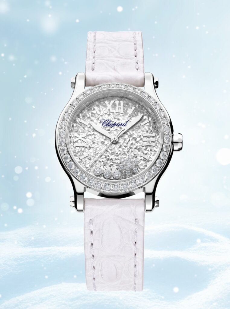 隨冬日而來的Happy Snowflakes腕錶來自於蕭邦(Chopard)將近30年歷史的Happy Sport系列,該系列以精鋼和鑽石的巧妙結合所聞名,最具代表性的特征則是雙層藍寶石水晶錶殼之間靈動起舞的活動鑽石。該特征工藝伴隨著1976年蕭邦工作坊的誕生而興起。除三顆活動鑽石,Happy Snowflakes錶盤兩層藍寶石水晶玻璃之間增加了一朵18kt白金鑲嵌雪花鑽石。作為背景的特製銀色鍛製錶盤,以多重折射方式捕捉光線。手腕活動間,如同雪球一般的活動鑽石伴隨著雪花在銀色錶盤上無拘無束地翩翩起舞,在鑲鑽錶圈、緞面白色皮革錶帶襯托下就仿佛白茫茫的天地中雪花飛舞的奇景。