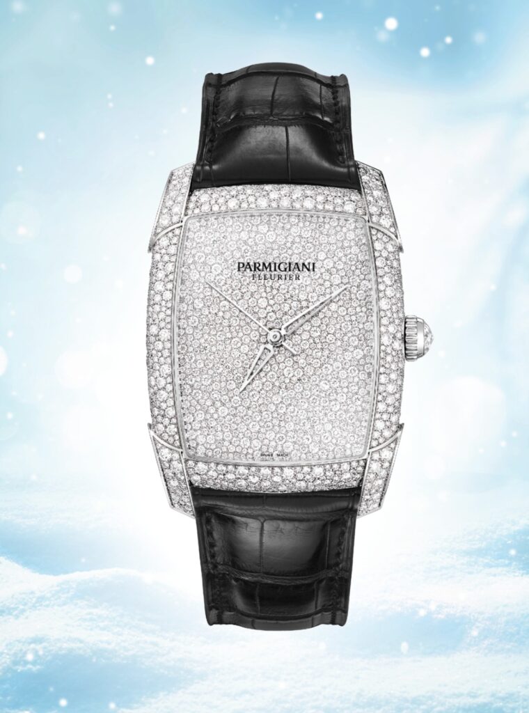 Kalpa系列對帕瑪強尼(Parmigiani Fleurier)具有非凡意義,該系列以酒桶型外觀作為標識。而寬闊堅實的酒桶型腕錶從錶殼到錶盤都鑲滿了鑽石之後戴在手上的感覺,就好像一架鑽石打造的飛機從天空飛過一般耀眼奪目,想不引人矚目都十分困難。該款腕錶的錶殼由18kt白金打造,使用665顆鑽石滿鑲,總重接近3克拉;為了更好的展示效果,錶盤使用了更細碎的鑽石鑲嵌,達到了714顆鑽石,總重約1.9克拉。很難想象,這麼多鑽石在光線下形成的火彩以及反光是多麼令人目眩神迷!這種感覺,就好比一個熱帶長大的人終於親眼目睹鵝毛大雪漫天飛舞的震撼一般。