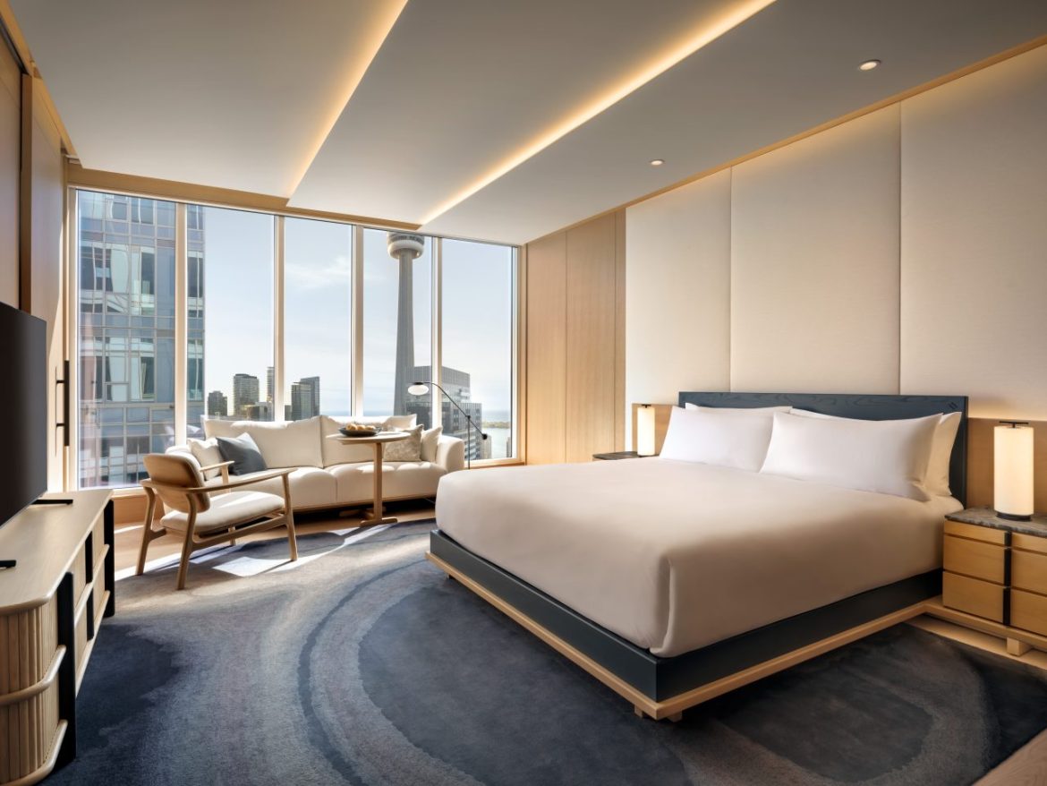 設計上延續了日式風格元素,以木質為主體材質,搭配淺色牆面與簡潔家具。浴室內配備日本檜木浴缸,是少數在北美飯店中能見到的配置。牆面與照明細節也都有呼應自然材質的用心,強調不過度設計的節制。整體空間讓人聯想到東京或京都的高端旅宿,只是背景從寧靜山景換成了加拿大都市輪廓。這裡沒有繁複的裝飾語言,而是以乾淨清楚的線條,傳遞一種與其說是奢華,不如說是克制下的舒適。