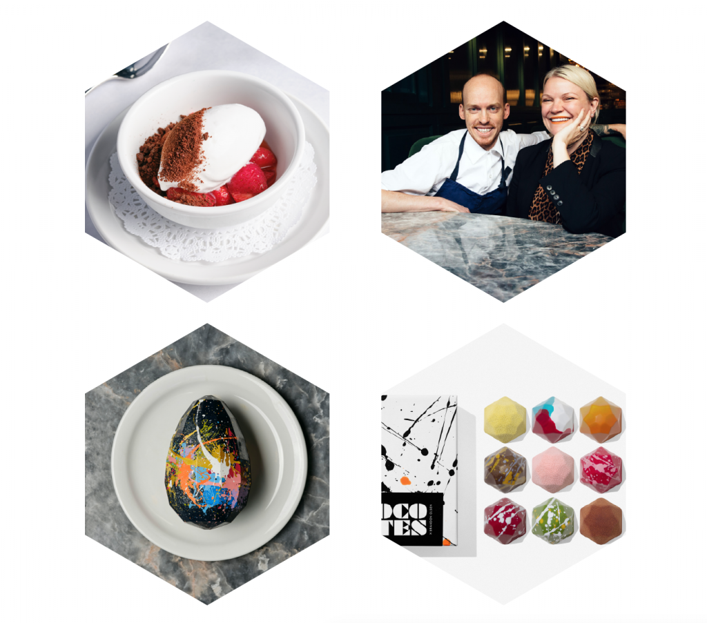 不得不承認,我們身處於一個「顏值至上」的時代。但無論對食物外型有多講究,CXBO獨一無二的立體六邊形巧克力總是能夠讓人眼前一亮。一顆顆披上了潑墨或是五彩外衣的巧克力絕非虛有其表,一口咬下,柚子清酒、青檸生薑、玫瑰茴香⋯⋯令人意想不到的味道在舌尖上像是小宇宙般爆發,主廚Brandon就彷彿是現實生活中的威利.旺卡。讓人出乎意料的是,他雖然有著多年包括在The French Laundry、Bar Isabel等知名餐廳工作的經驗,但從來沒有接受過專業的巧克力製作訓練。CXBO的工作量超出常人想像,手工製作一批巧克力大致需要三天時間。但是在如今能夠把興趣當作職業,主廚Brandon是幸運的。「Brandon一直說我是那個藝術家,但他自己其實也是,」Keenlyside對我們說,「我比較偏重概念,他就更天馬行空。」主廚Brandon製作巧克力時不受限制的想像力,再加上Keenlyside對於包裝、宣傳、銷售理性而敏銳的認知,終究讓無形的創意成為了可觸摸又可食的美味。