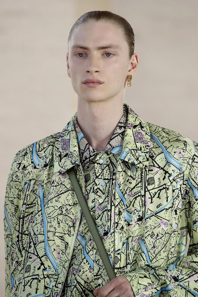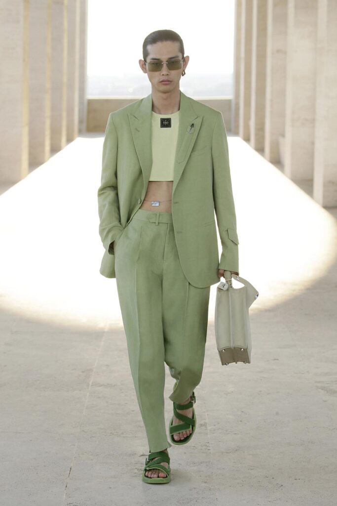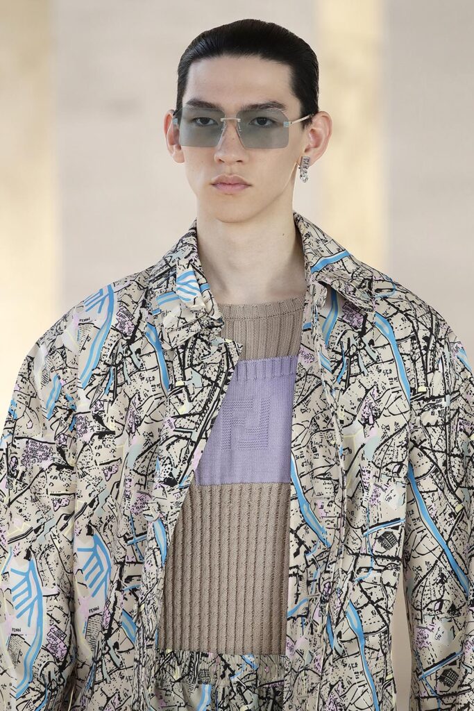 「人們看待事物的方式,以及出發的視角,從沒像今天這麽重要,」芬迪男裝及配飾創意總監Silvia Venturini Fendi分享疫情時代誕生的2022春夏男裝系列創作靈感:「源自每個人自身的觀念影響著我們的世界觀,至於我的個人角度,是從義大利文明宮(Palazzo della Civiltà Italiana)的拱門和屋頂出發的,仿佛俯瞰整個羅馬城。」於是,我們通過芬迪2022春夏男裝系列感受到了羅馬一天之中顔色的變化,以及在不同視角下,城市變化的魅力。 清晨天剛蒙蒙亮時的淺綠色,薄霧籠罩的青色,晚霞映照的藍紫色……天空在不同時刻呈現的轉瞬即逝的色彩,也可以成為一種永恆。 此前存於芬迪歷史檔案的羅馬城繪圖,找到了新居。