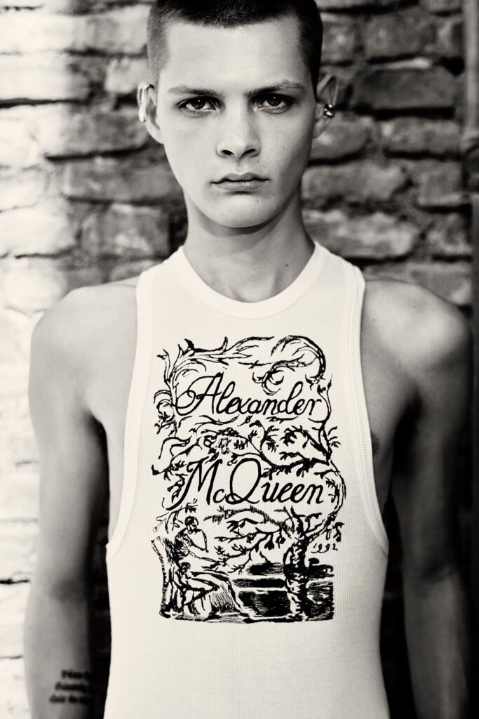 威廉·布萊克,他身處啓蒙時代,卻不願隨波逐流,而是偏離理性,試圖從自然、本源尋找價值。布萊克可以被視為那個時代的叛逆者,即使不被理解,也堅持遵從自己内心創作詩歌與繪畫作品。某種意義上來説,不羈又逆反的麥昆本人和布萊克倒是有幾分相似,如果他們生活在一個時代,或許能產生靈魂共鳴。以布萊克為靈感源泉的亞歷山大麥昆2022春夏男裝系列像是黑暗中生長出的花朵,英倫憂鬱氣質之中透露出頑强的生命力,以及無處藏匿的詩意。
