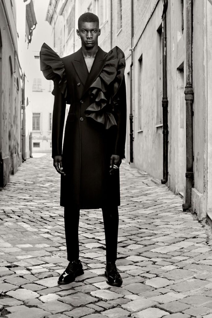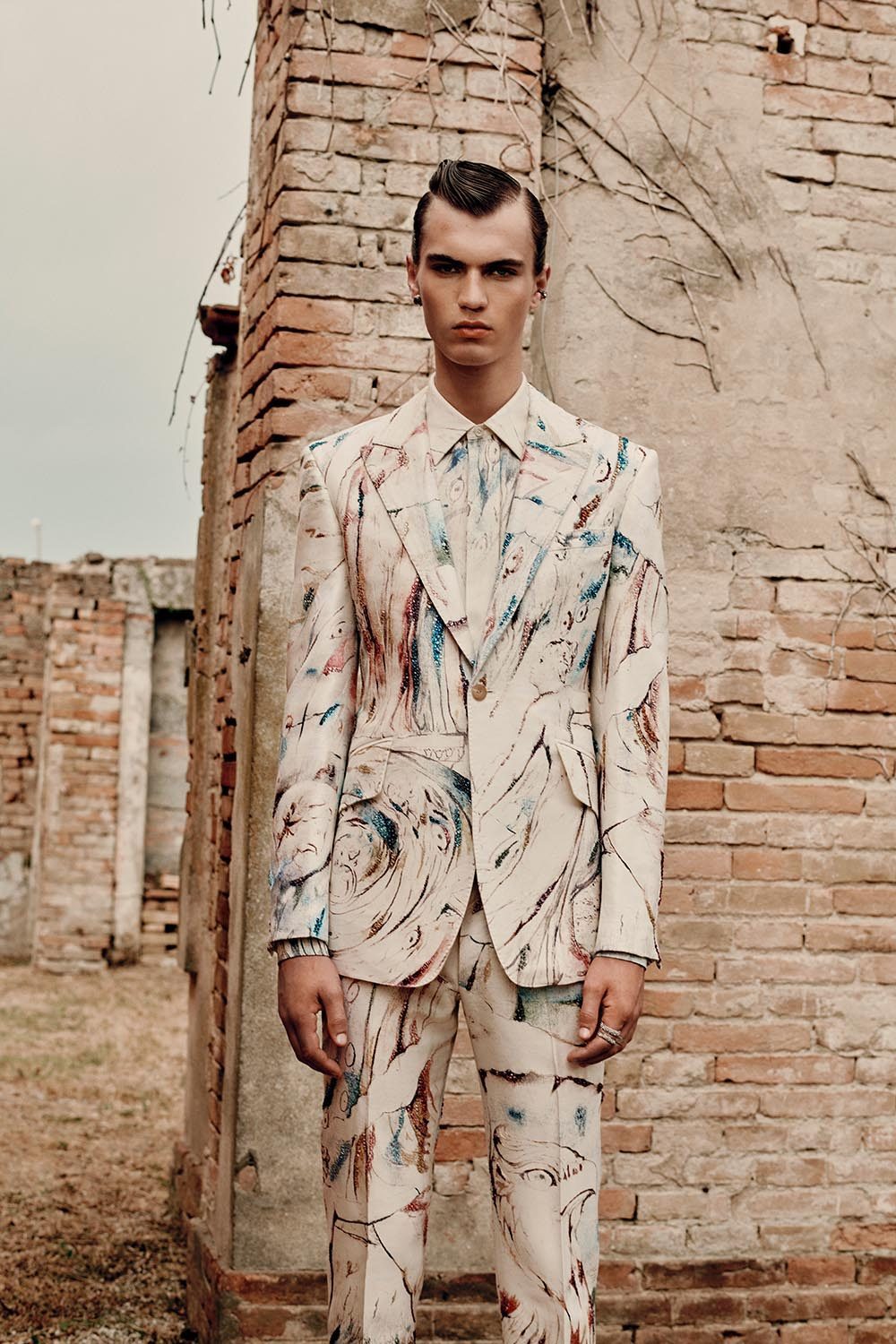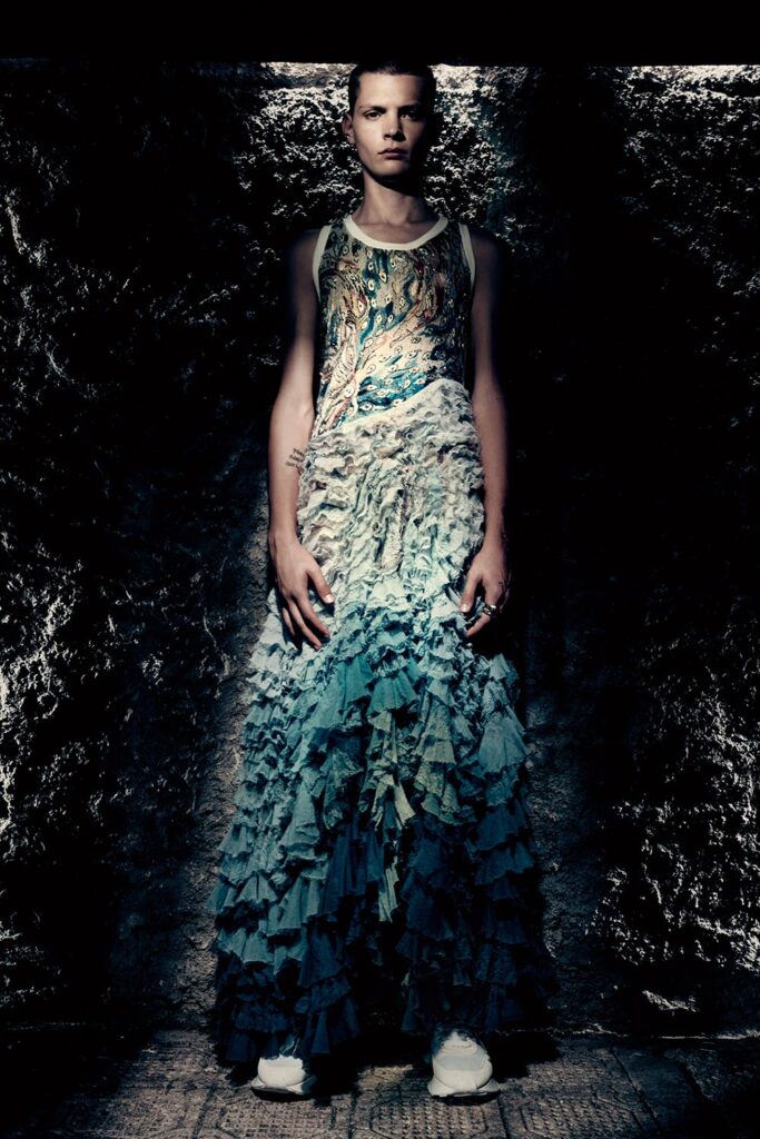 將男子氣設計糅合帶有陰柔美的細節,已逐漸成為亞歷山大麥昆的一個設計符碼。比如2021春夏男裝系列,我們見到了大裙擺風衣、帶有巨大蝴蝶結的西裝。2022春夏男裝,則有巨型蓬鬆褶,以及雪紡、薄紗、透明硬紗碎布組成的裙身等。裁剪利落的印花羊毛西裝套裝、帶有蓬鬆褶邊的棉府綢上衣等作品印有布萊克在十九世紀為但丁著作《神曲》(Divine Comedy)創作的插圖——「Beatrice Addressing Dante from the Car」。畫中描繪但丁由他的繆斯Beatrice指引進入天堂的場景,Beatrice身邊圍繞化身神獸的使徒,幸福的靈魂找到了歸宿。或許通過引用布萊克的畫作,亞歷山大麥昆想向世人傳遞一種美好期冀,創造一個抛開凡塵一切紛擾的理想世界。